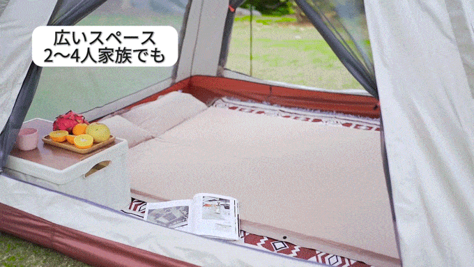広いスペースを備えており、大人2~4人が入れます。コットやテーブルなども使用可能なので、アウドドアでも快適に過ごすことができます。