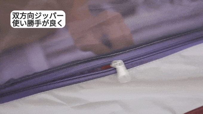 両端に引き手がついた双方向ジッパーを搭載しており、開閉方向をお好みで操作することができます。通常のジッパーよりも使い勝手が良く、例えばテントのドアや窓を開けたい場合にも簡単に開閉することができます。
