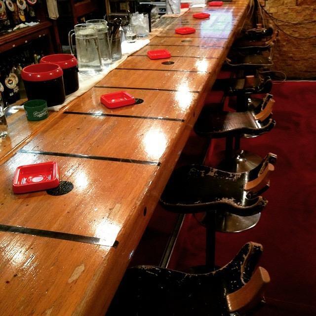 店内は楽器たちとギターを模したチェア、ギターフレットを模したカウンターテーブル、赤を基調としたレトロな店内、来店時に撮影した国内外の驚くべきミュージシャンの数々など、音楽好きなお客様にはたまらない店内です