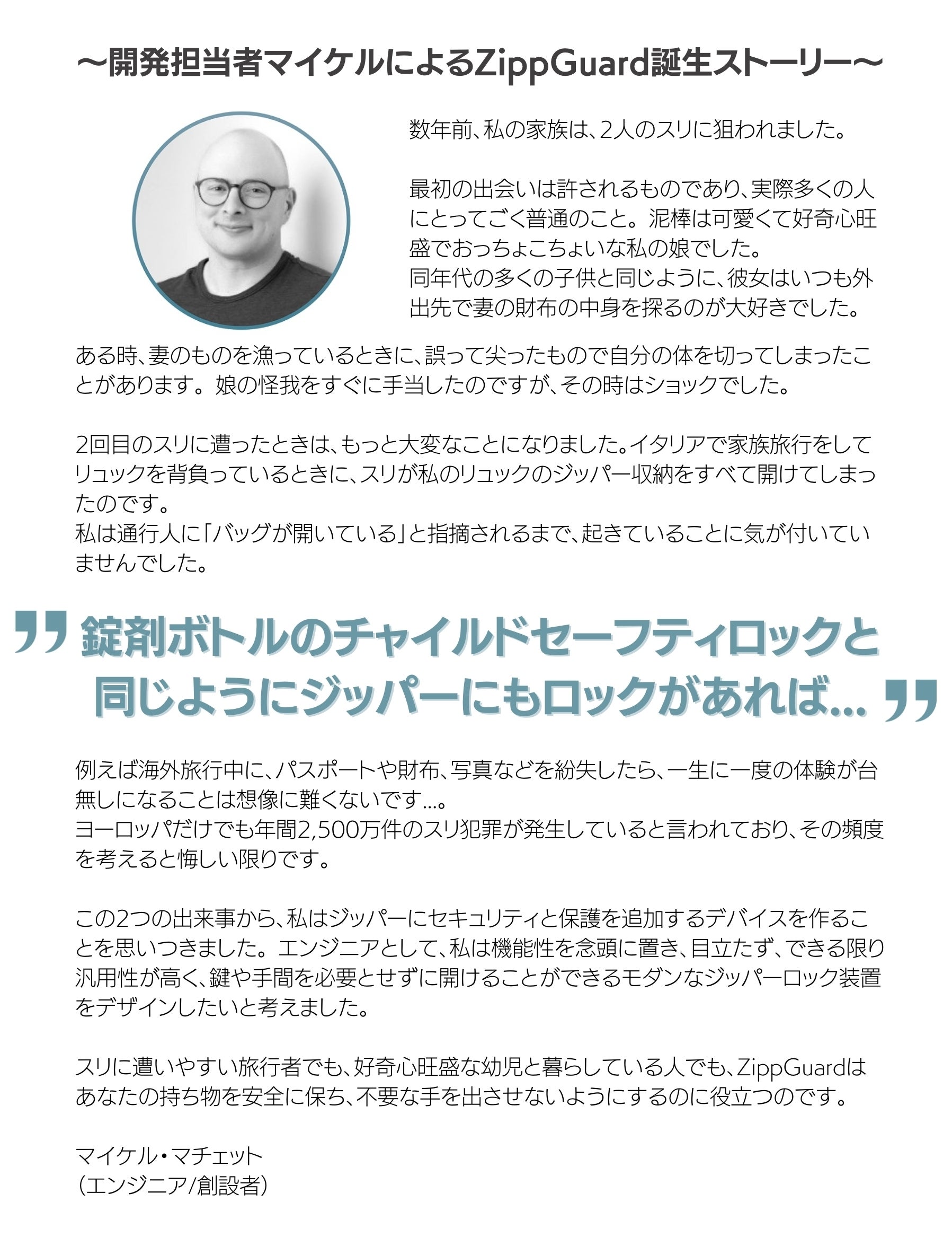 今回の『ZippGuard』についてですが、商品説明内でもお伝えしています様に「日本人だからこそ」スリなどの犯罪に対して、もっと危機管理を持っていただきたいという想いがあり、この機会にぜひmachi-yaにてご紹介したいと思った次第です。