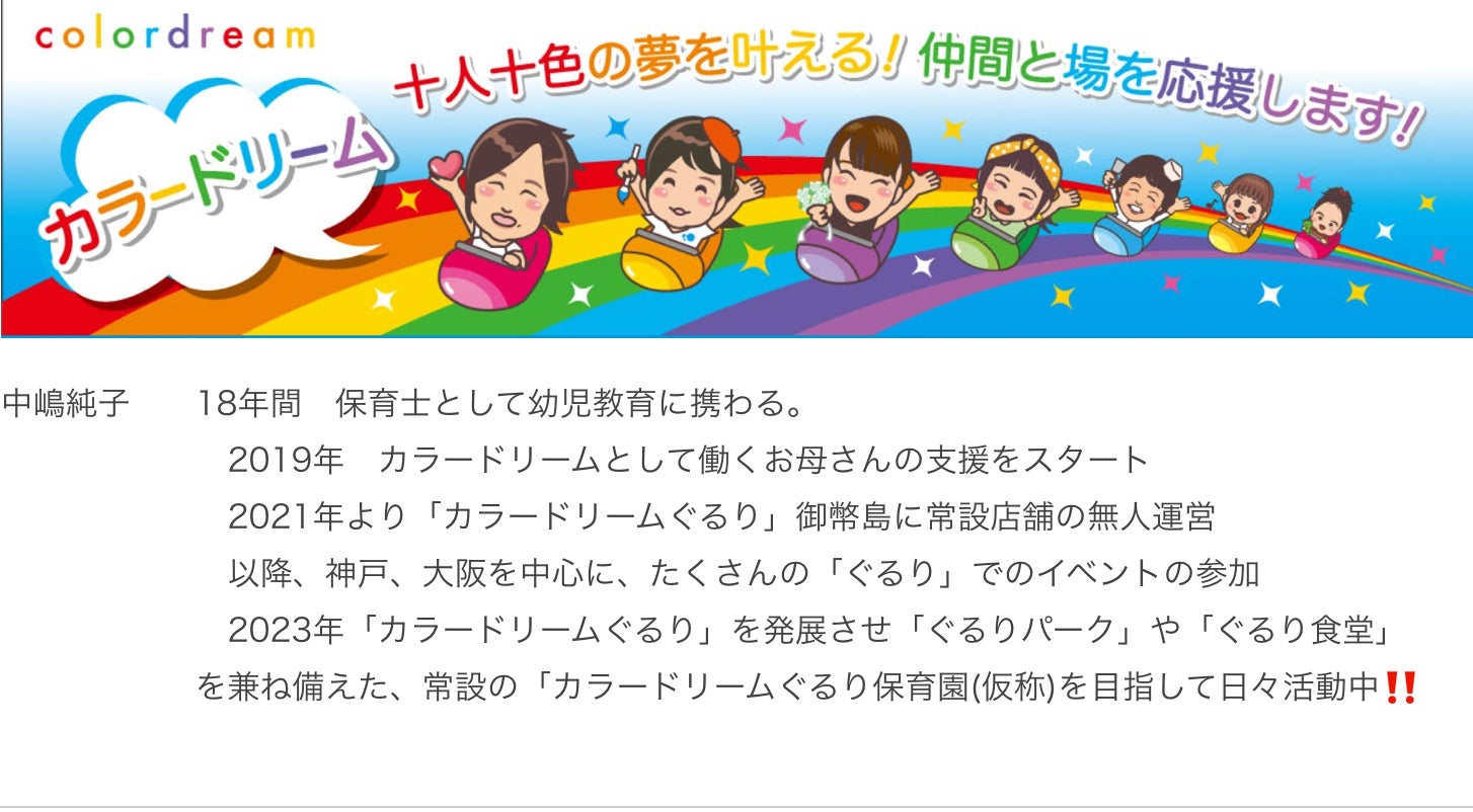 申し遅れました。私、中嶋純子は全国数ある「ぐるり」の中でも大阪を拠点とする「カラードリームぐるり」で活動を行なっています。「もっと仲間を増やして活動の幅を広げたい!」そう声に出したところ別のコミュニティーの仲間が『それなら普段の「ぐるり」より、もっと盛大なコラボイベントをしよう!』と言い出しました。もしそのイベントが成功すれば、私が今まで思い描いていた「親子の居場所作り」に向けた未来へ大きく加速しそうな予感がしています。