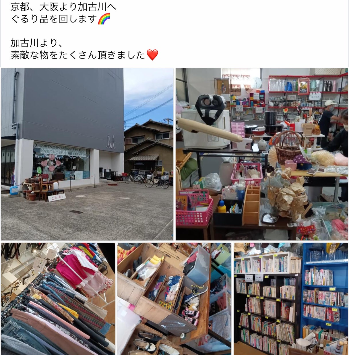 2023/08/30 12:56無料お譲り交換会の「ぐるり」での活動は人との出会いがたくさん有って、商品もたくさん(売るものではないので「ぐるり品」と呼んでいます)京都、大阪から加古川へ、更に9月18日にはぐるりと回って大阪に戻ってきます。交通費も時間も掛かりますが、本当にいいご縁をたくさん頂いています。「出張ぐるり」のリターンもご用意しました残り4日となりましたが、クラファンのあとが本番です。まだまだこれから続きます。是非ご支援頂きたくよろしくお願い致します。 もっと見る