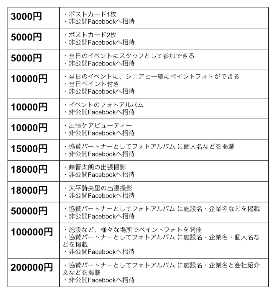 2023/09/05 12:24ご支援・ご協力いただいた皆様、本当にありがとうございました!!ご支援者数:61人ご支援金額:576000円皆様のお力添えがなければ、これだけのご支援をいただくことは、本当に難しかったと思います。「誰もが老いを楽しめる世界」を目指し、シニアフォトグラファーとして今まで活動していきました。そんな中で、「その人らしさ溢れる環境を創りつつ、写真撮影を行う」ことを作業療法士の視点を活かして実践しています。今回の「シニアペイントフォト」というプロジェクトは、日本で初めてのイベントです。最近、人気が高まりつつあつ「ペイントフォト」を高齢者が行うというものです。ある1人の高齢者との約束を果たすため、その第一歩として、「Enjoy aging」を立ち上げ、企画しました。第一回「シニアペイントフォト」は、10/14に大阪で開催します。その人らしさ溢れる空間にして、「高齢者の魅力」や「高齢者の人生の価値」を多くの人に届けるために、第一回、必ず成功させます。また、今後も定期的に全国各地で開催していきます。これからも、よろしくお願いいたします。Enjoy aging 代表條 晋太朗 もっと見る