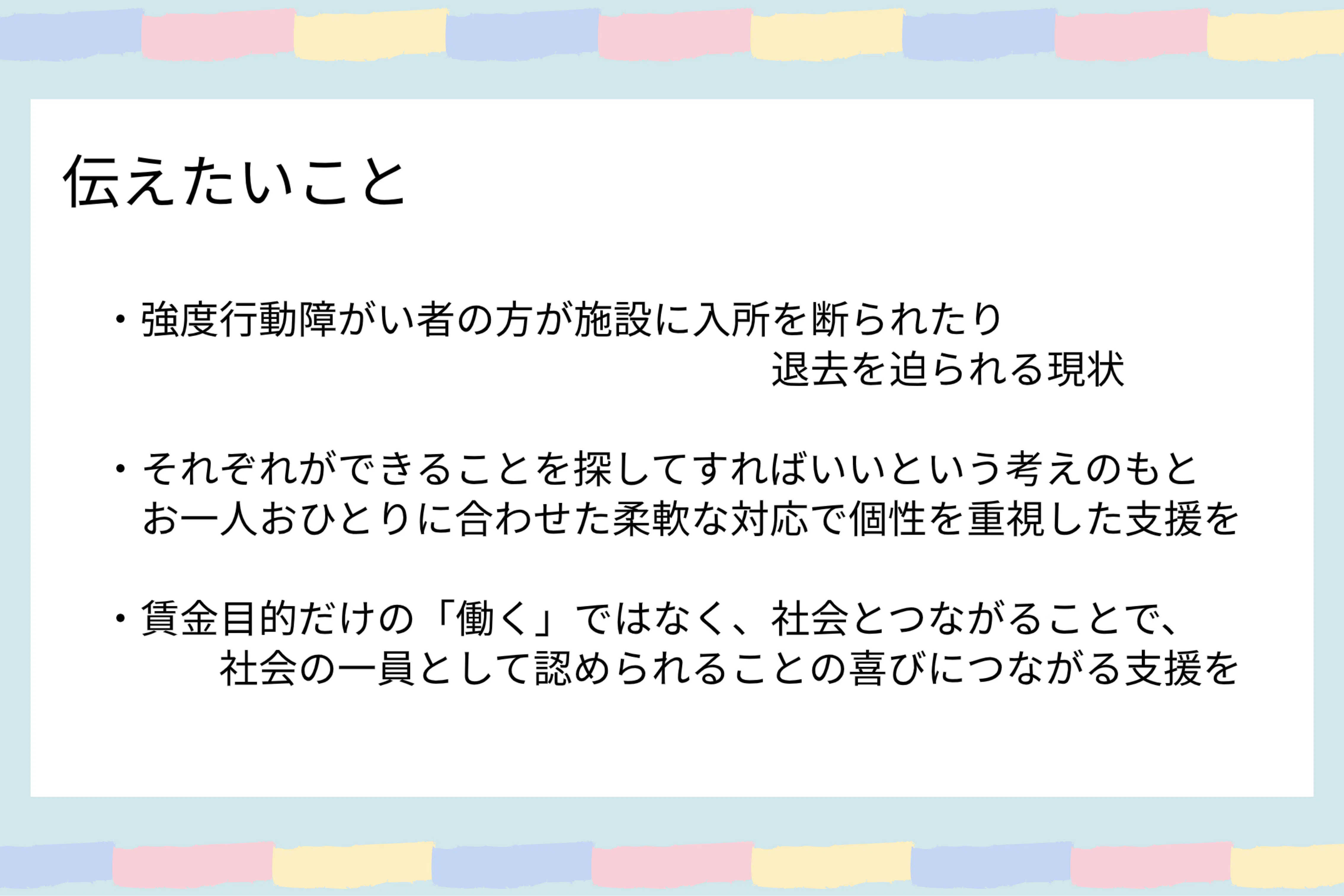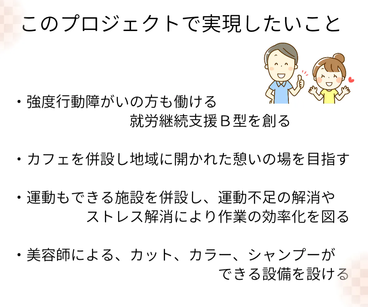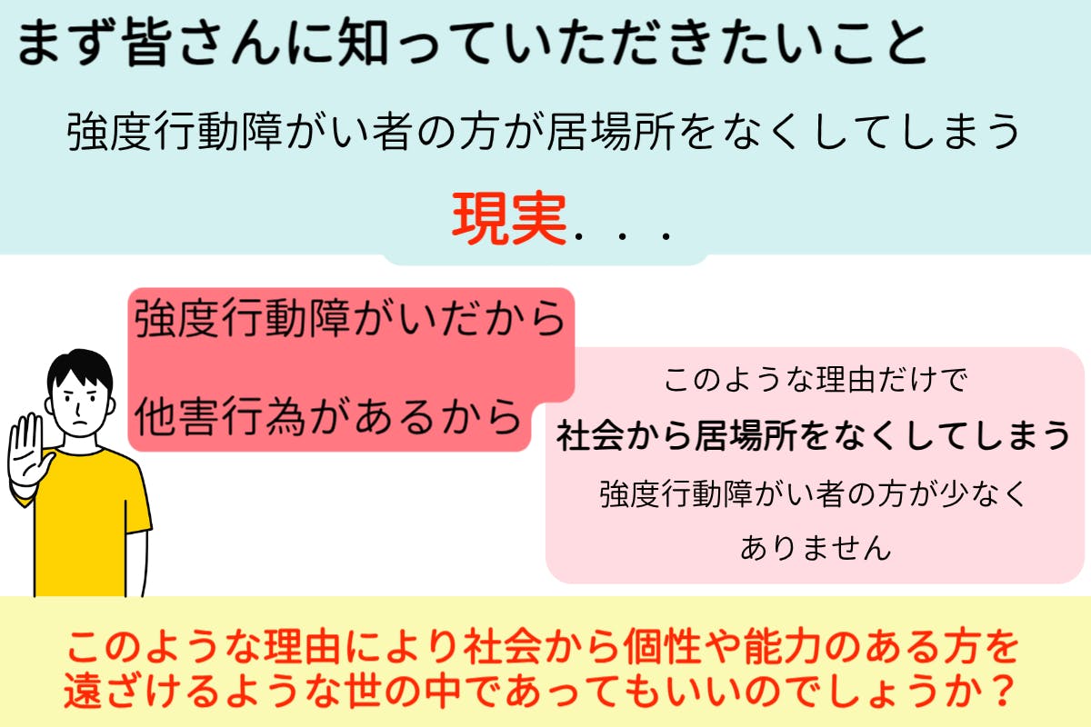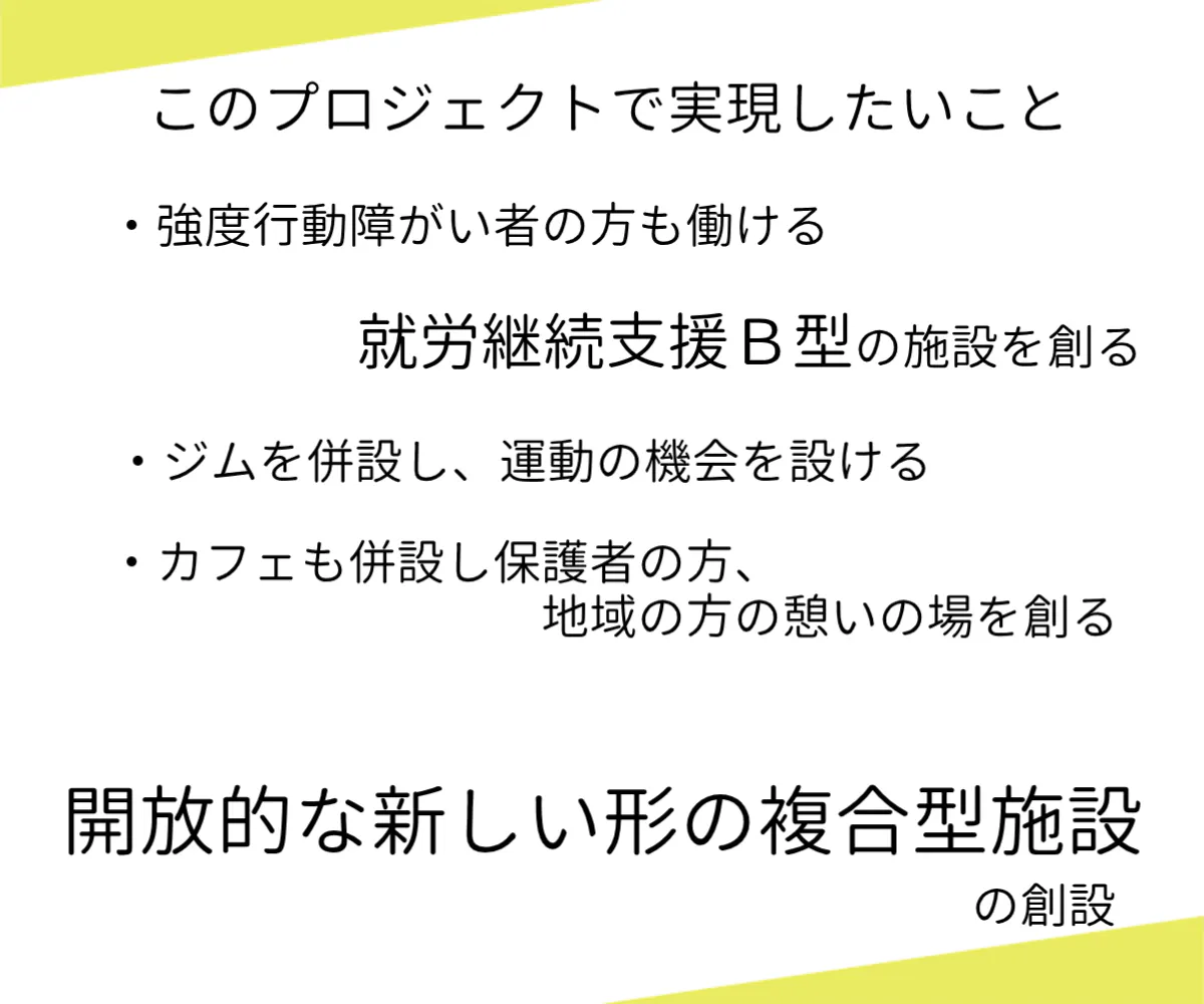 そこで、今回私たちが創りたい施設は強度行動障がい者の方も働ける就労継続支援B型の施設です。