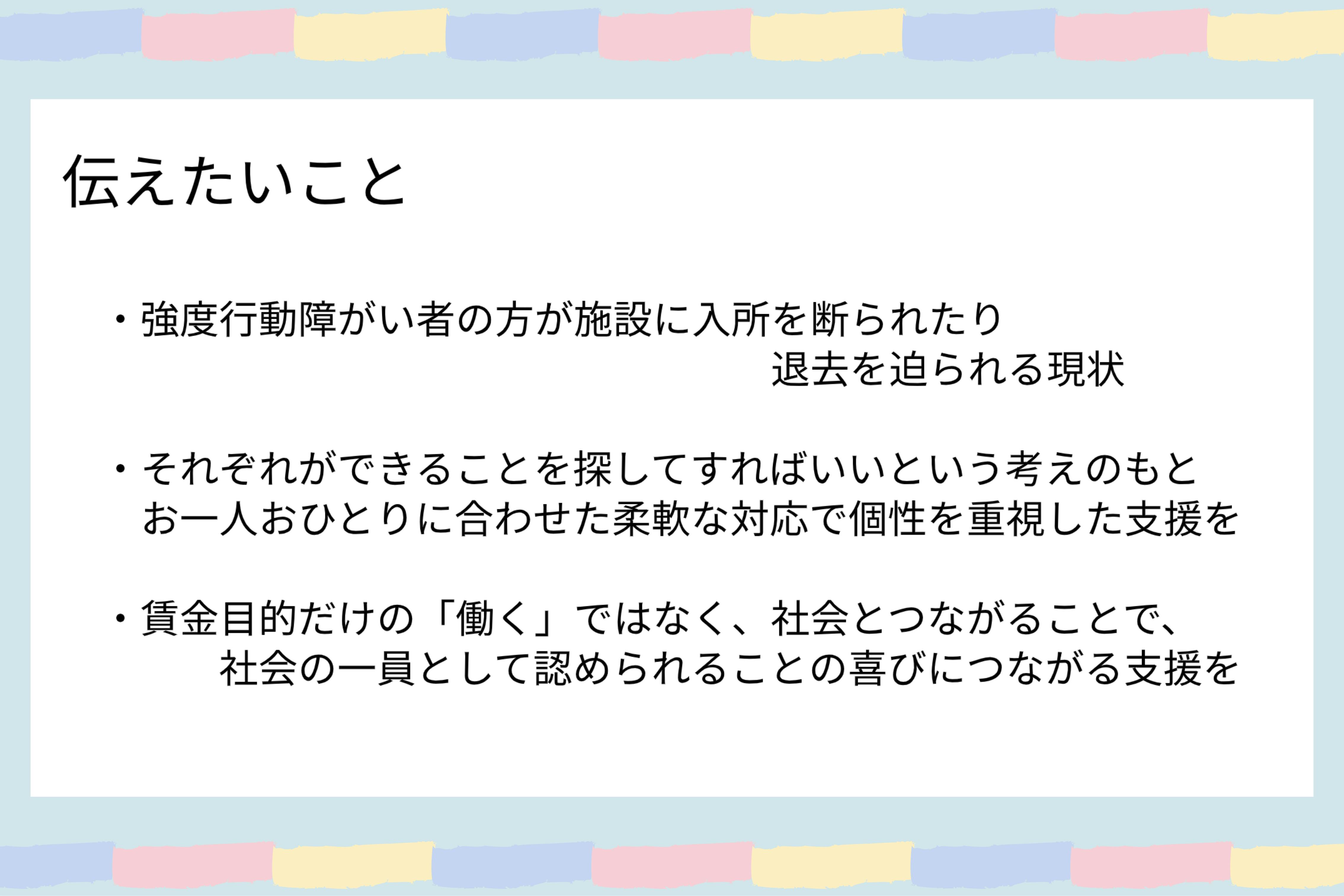 今回挑戦する就労継続支援の施設は、多くの強度行動障がいのある方の社会との懸け橋となると私たちは信じています。