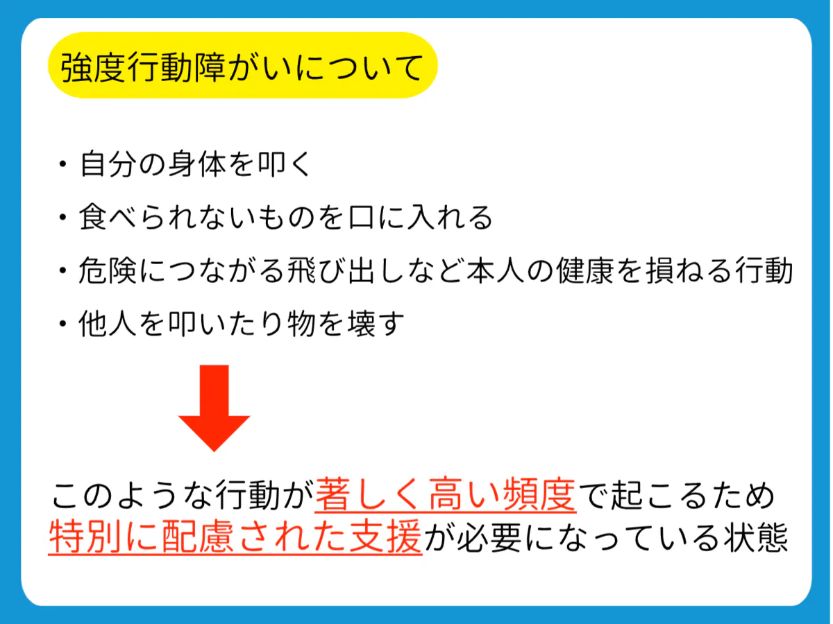 私たちが日々行動援護を通して関わらせていただいております方々は強度行動障がいと呼ばれる障がい者の方々です。