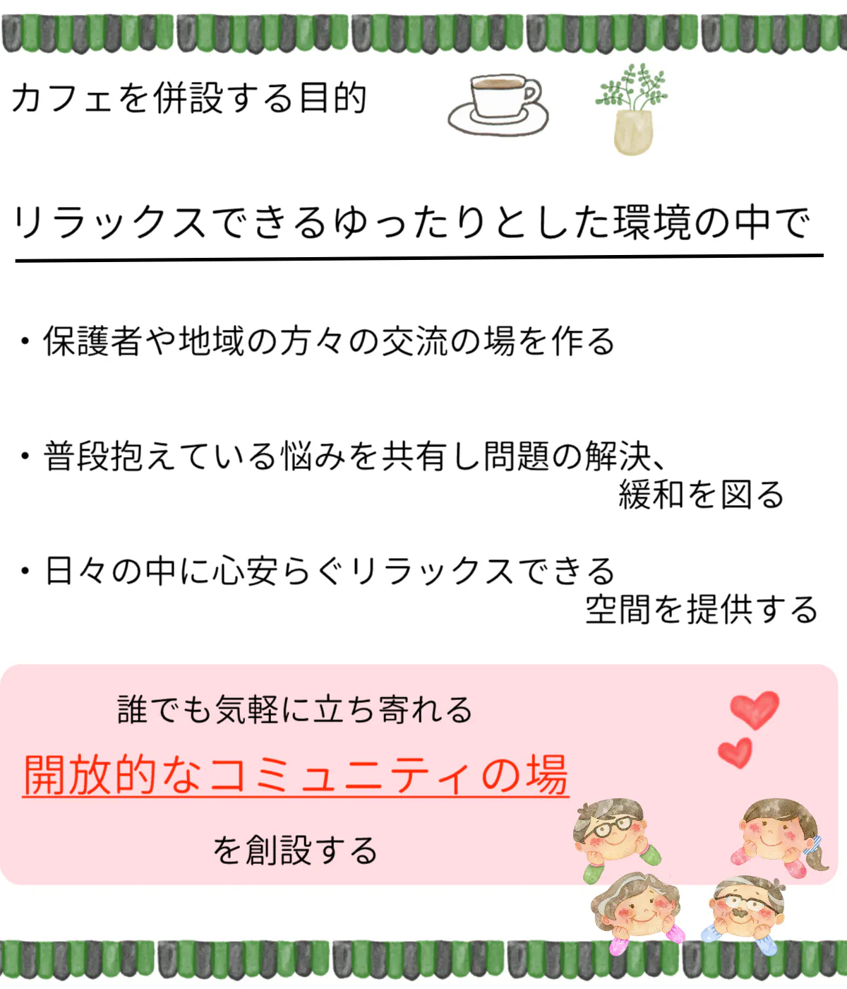 誰でも気軽に訪れることができる、地域に開かれたコミュニティの場を創りたいです。