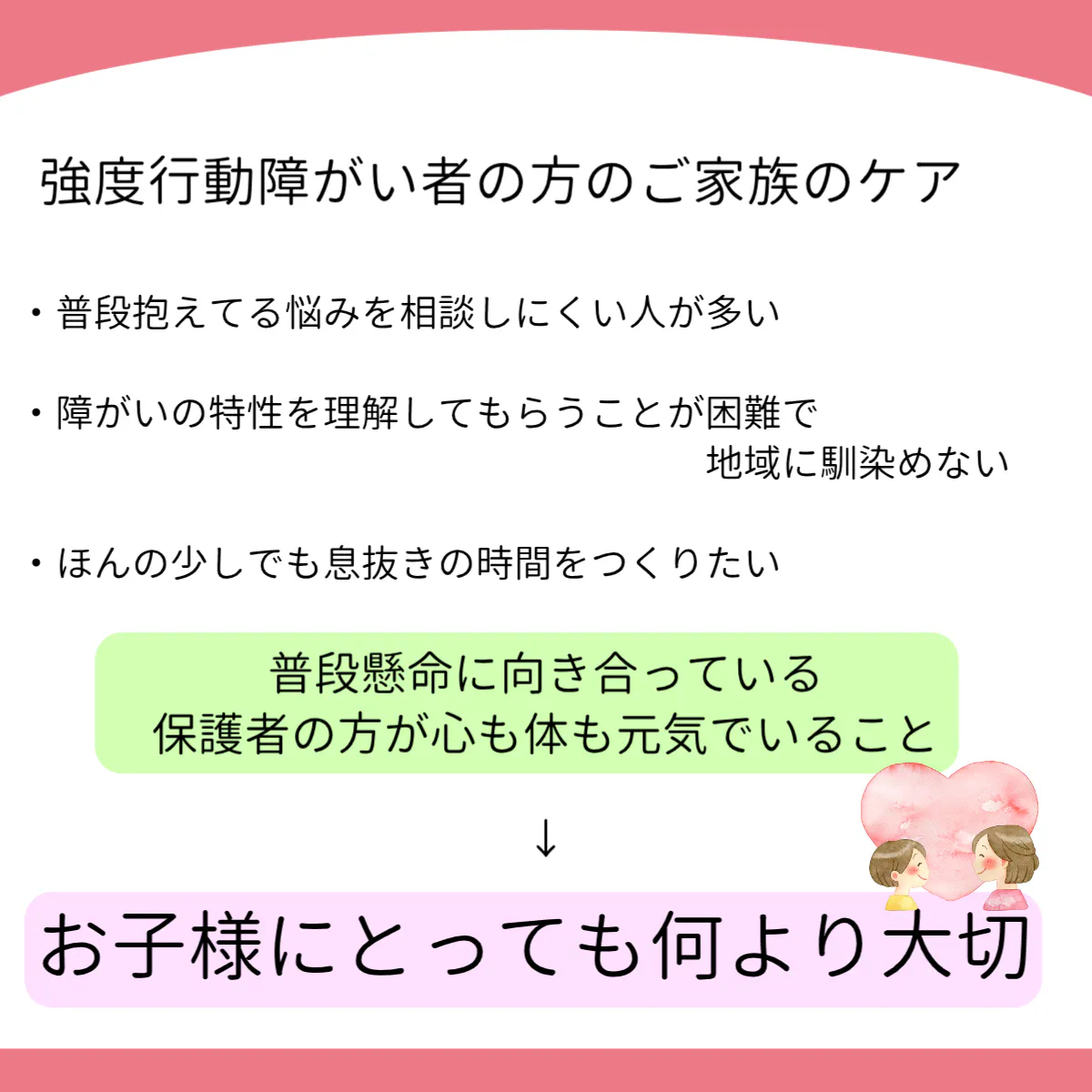 また、強度行動機能障がいをお持ちの方のご家族とお話をさせていただく中で