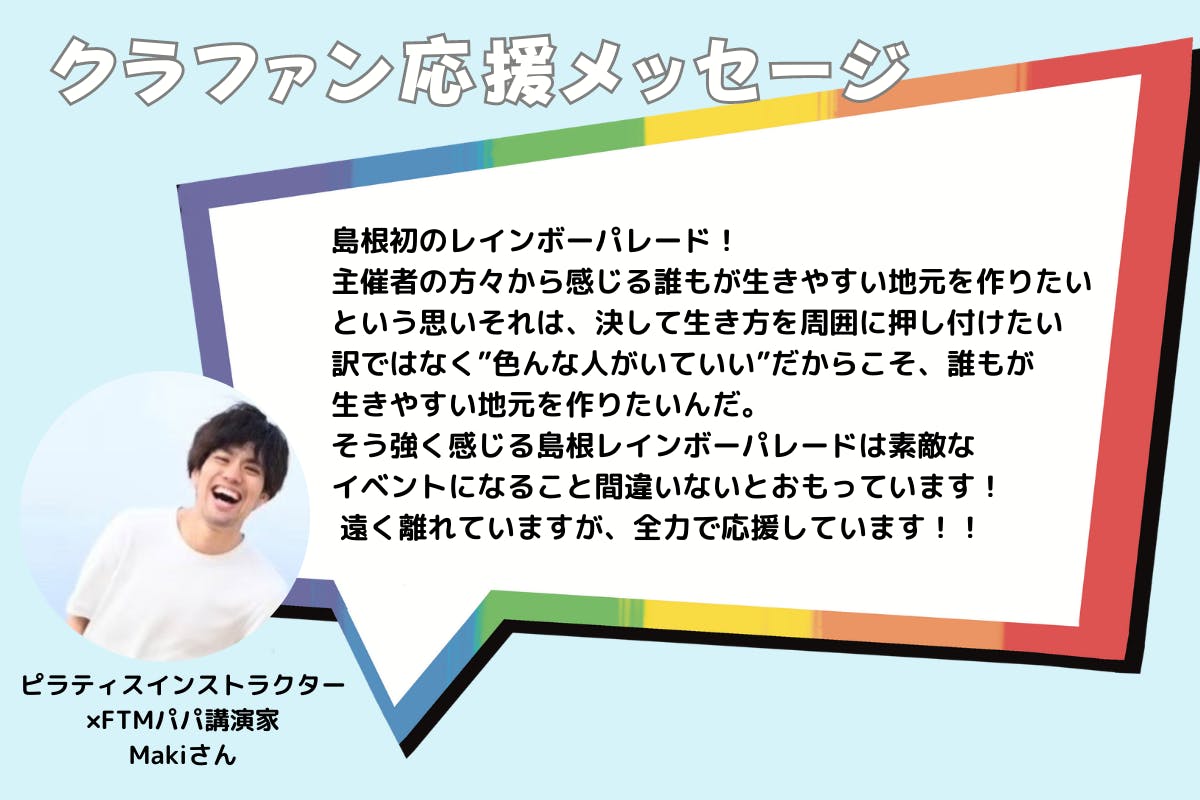 そう強く感じる島根レインボーパレードは素敵なイベントになること間違いないとおもっています! 遠く離れていますが、全力で応援しています!!