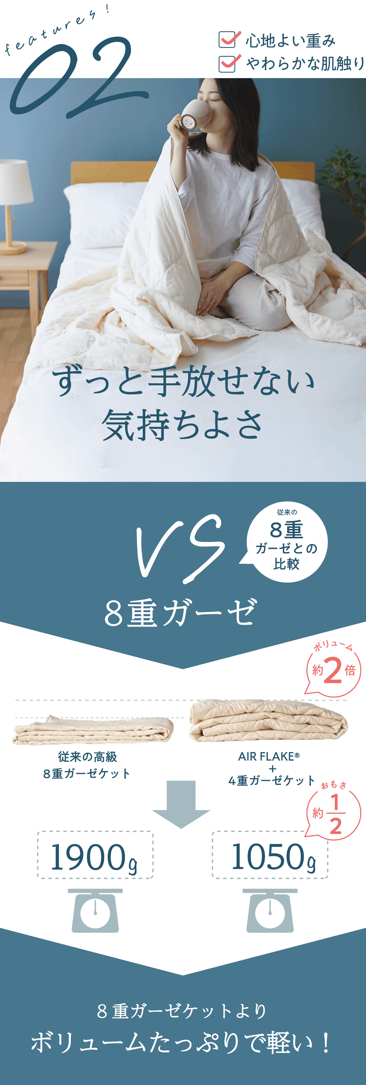 夏の寝冷えは、汗や水分が冷やされることで起こります。中綿のAIR FLAKE®️が、外側から冷やされることを防ぎ、また内側で快適に温度を維持してくれます。