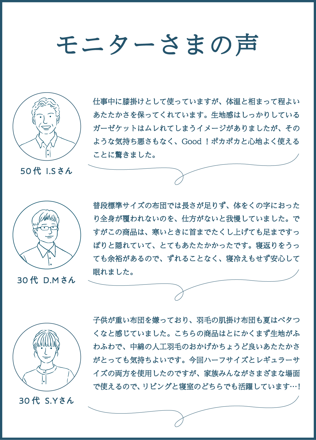 AIR FLAKE®︎は、他の短繊維綿とは違い長繊維構造なので、綿の吹き出しが起こりづらく、ガーゼ生地のような通気性の良い生地にも、使用することができるため、今回の設計が実現可能になりました。