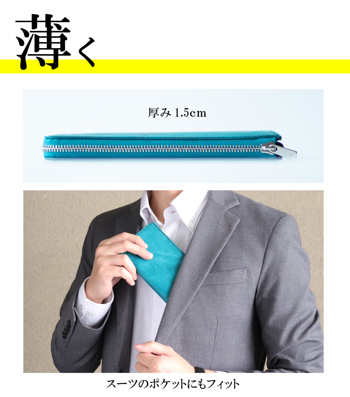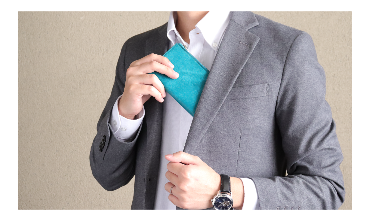 たっぷり収納しても厚みが変わらないため、ポケットに入れてもスーツのスタイルを崩しません。