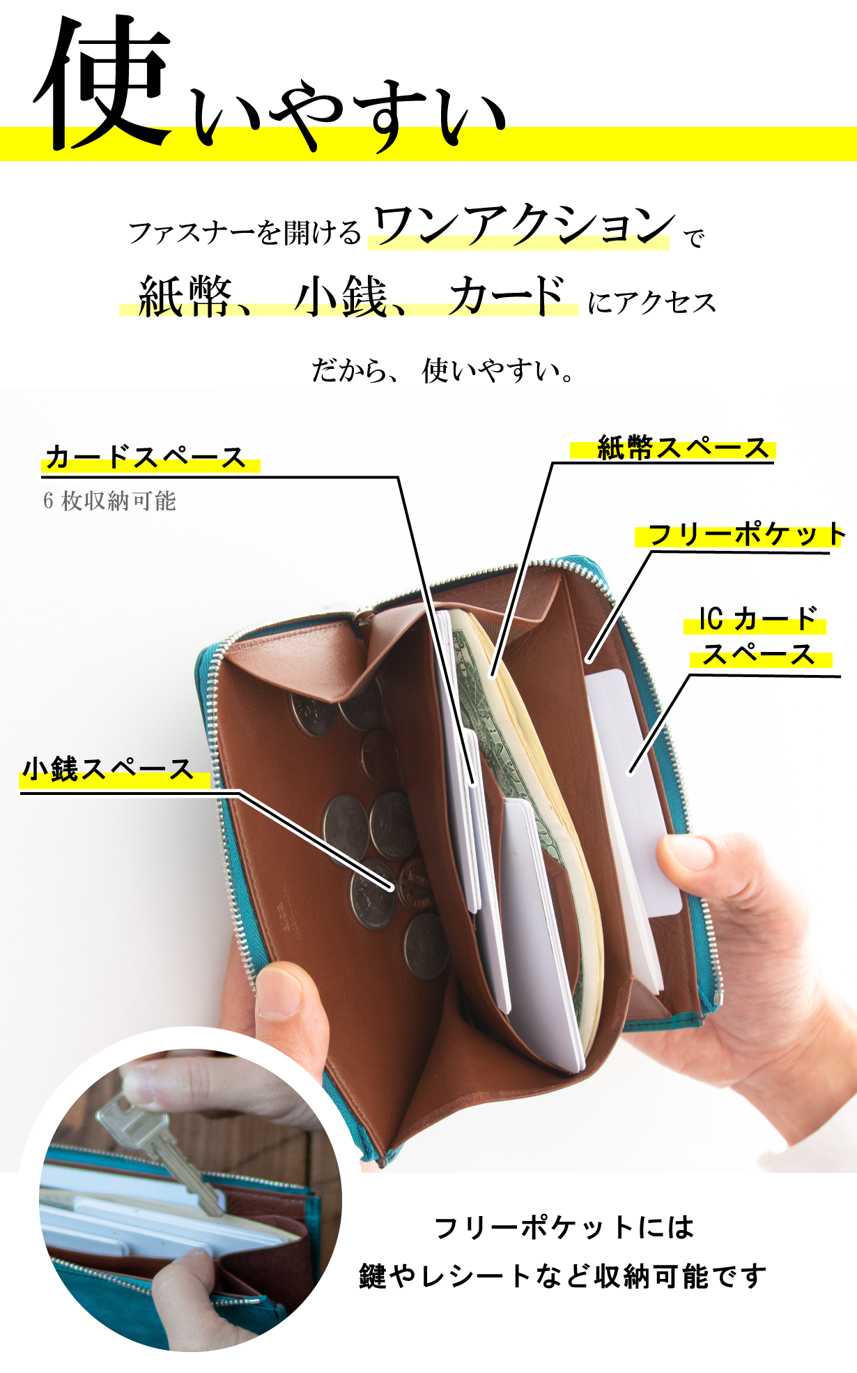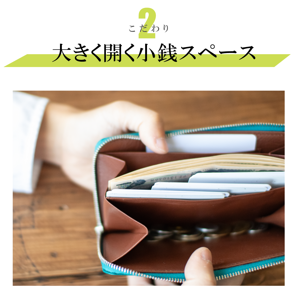 小銭入れスペースは大きく開くので取り出しやすく、収納も超簡単に。
