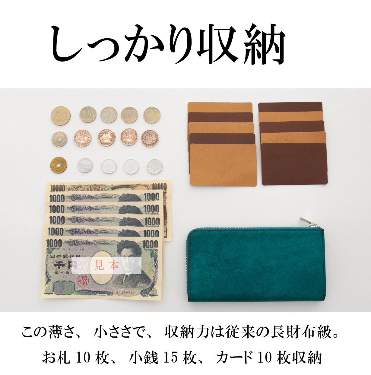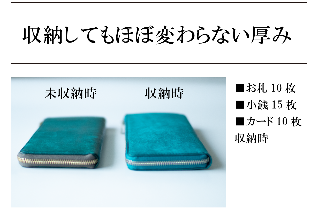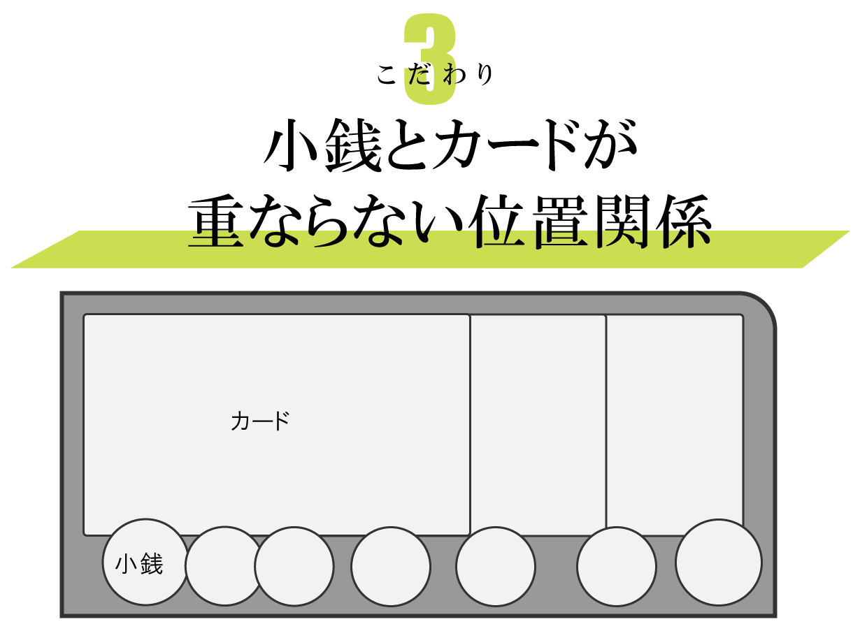 カードと小銭の重なりを最小限に抑えた構造になっているため、たくさん入れても嵩張りにくくなっています。