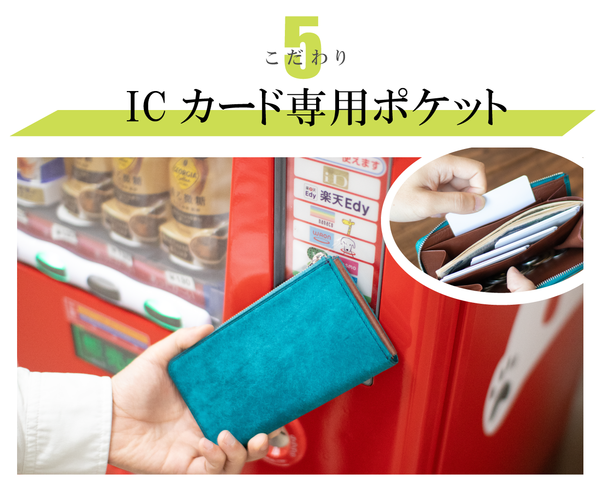 ICカード専用ポケットにICカードを入れておけばファスナーを開かずにタッチ決済が可能に。