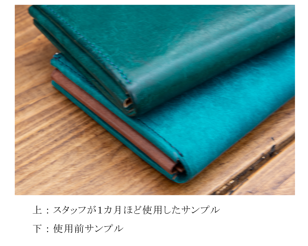 使い込むほどに色が深まり、この革特有の艶が出ます。かなりエイジングの振り幅が大きく、その速度も早い革になります。