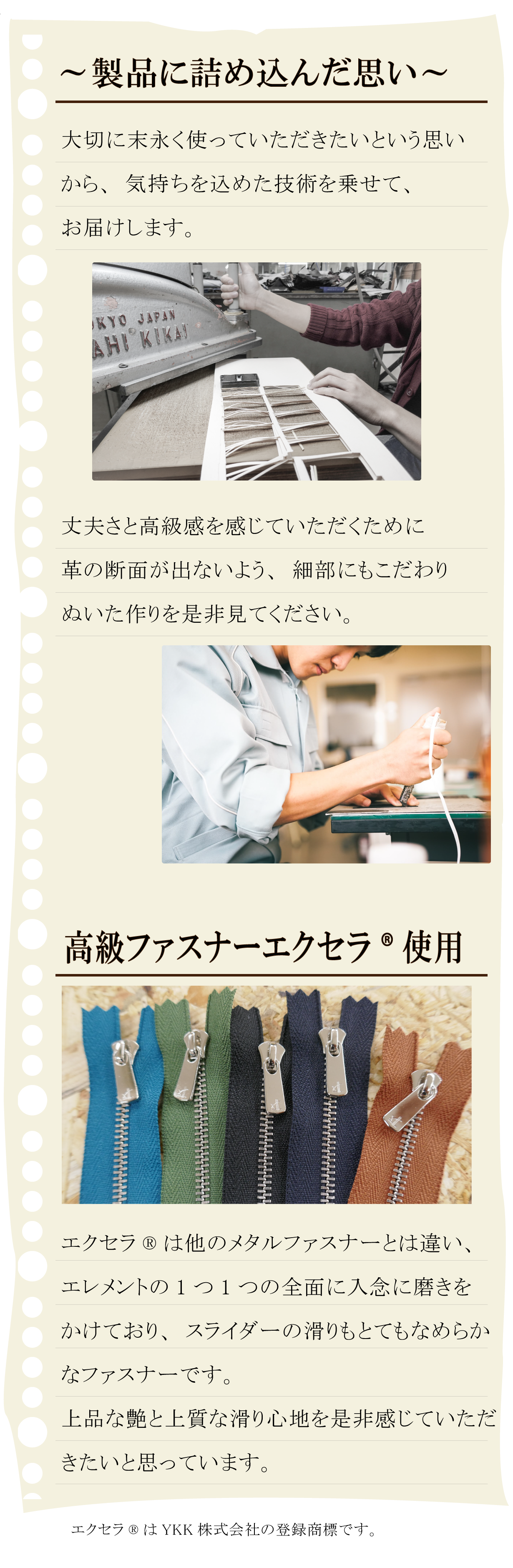 ※ 天然皮革の素材の特徴として、染色の際に生じる色の誤差(濃淡など)や血筋・シワ・傷跡・色ムラなど個別に差異がございます。これら全てが天然の証であり、革の魅力になります。ご了承いただけますようよろしくお願いいたします。