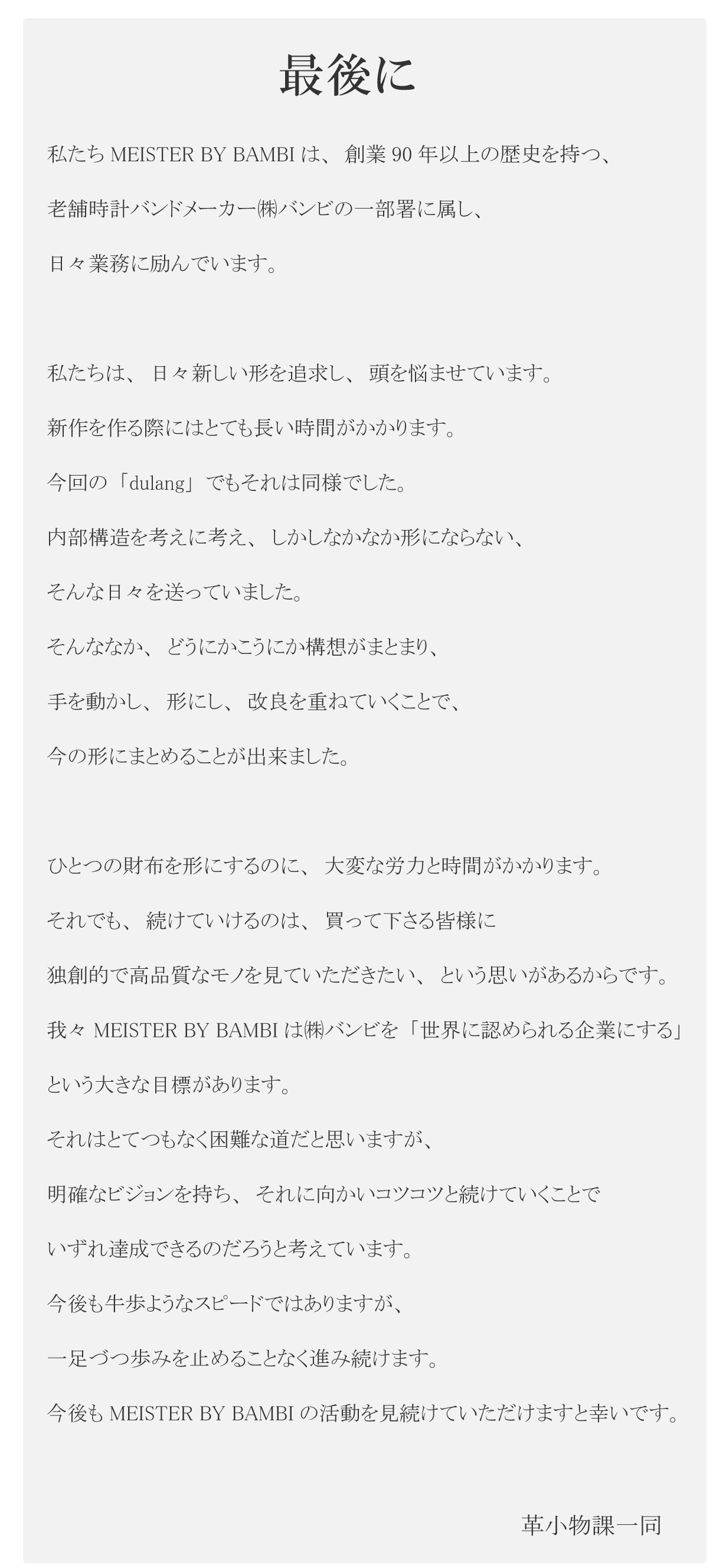 2024/07/16 15:36この度はdulangの応援並びにご支援頂き誠にありがとうございました。無事目標金額を達成することができました。さっそく量産に入らせて頂き、少しでも早くお届けできるよう尽力いたします。今後ともよろしくお願いいたします。革小物 菊池 もっと見る