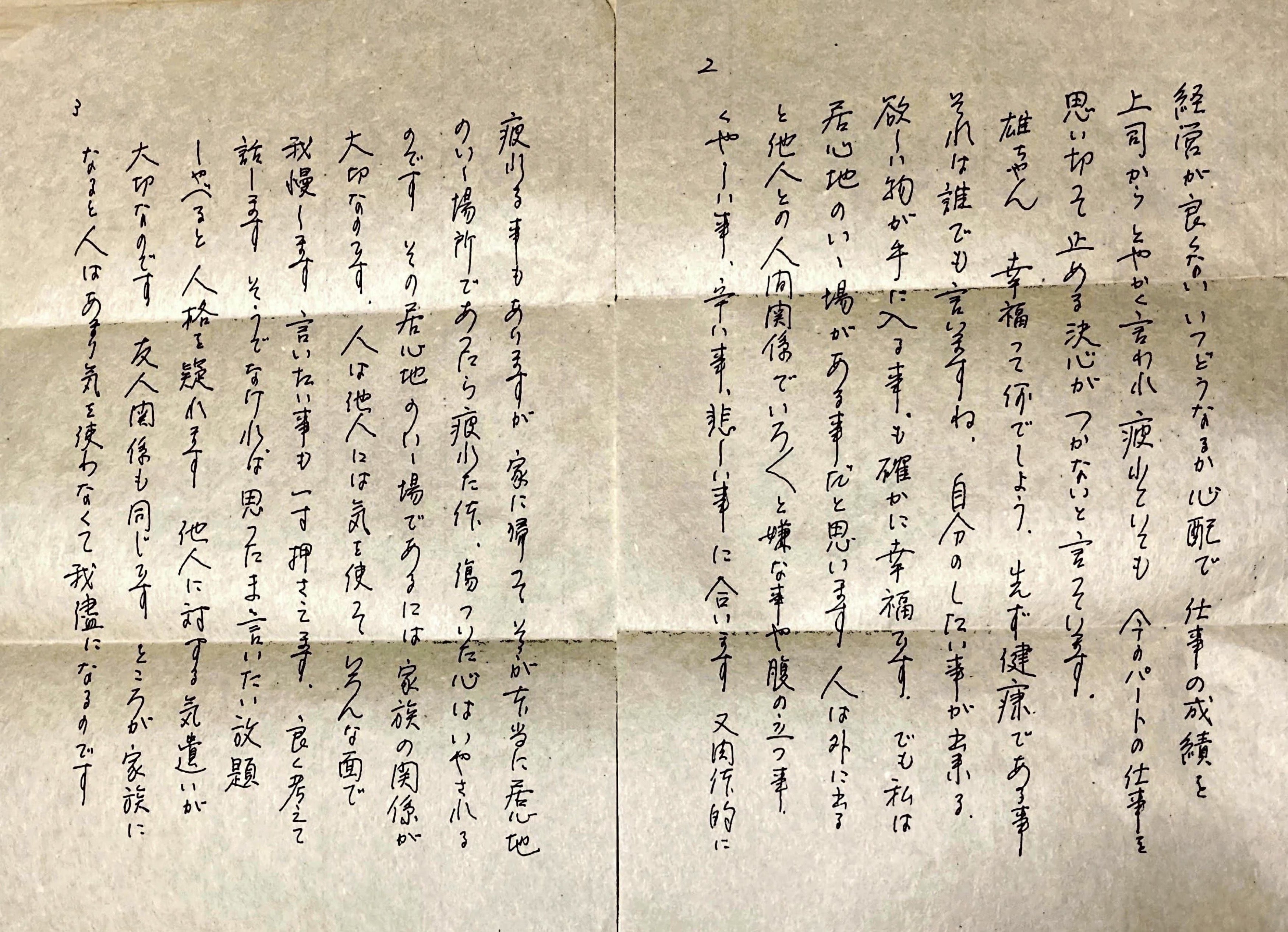 数年前、実家にて今は亡き祖母からの古びた手紙を見つけた。それは当時まだ未成年の頃の私に宛てられたものであったが、中年になった今の自分に、改めて祖母から時を超越して呼びかける問い。それは「本当の幸せとは何か?」という問いかけである。