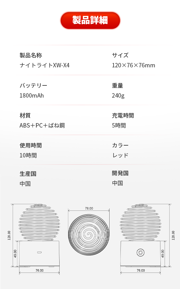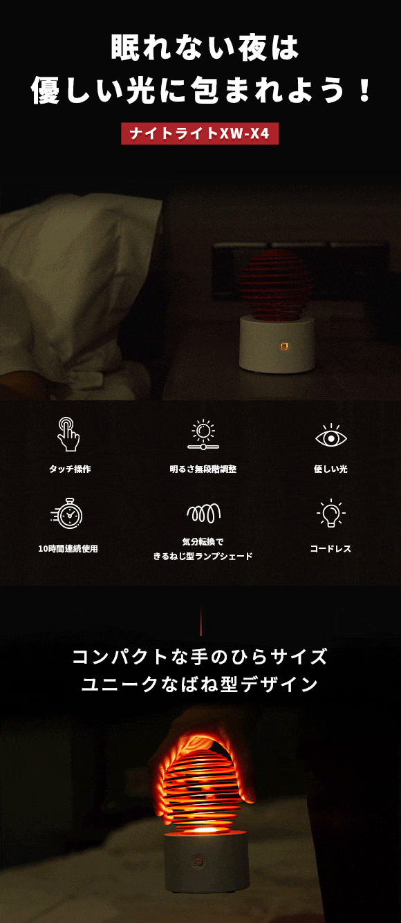 XW-X4はばね型デザインのランプシェードがユニークなナイトライトです。静電容量センサーを採用しており、ランプシェードに軽く触れるだけで明るさを無段階調整でき、ちらつかないLEDソフトライトの目に優しい光で空間を照らします。