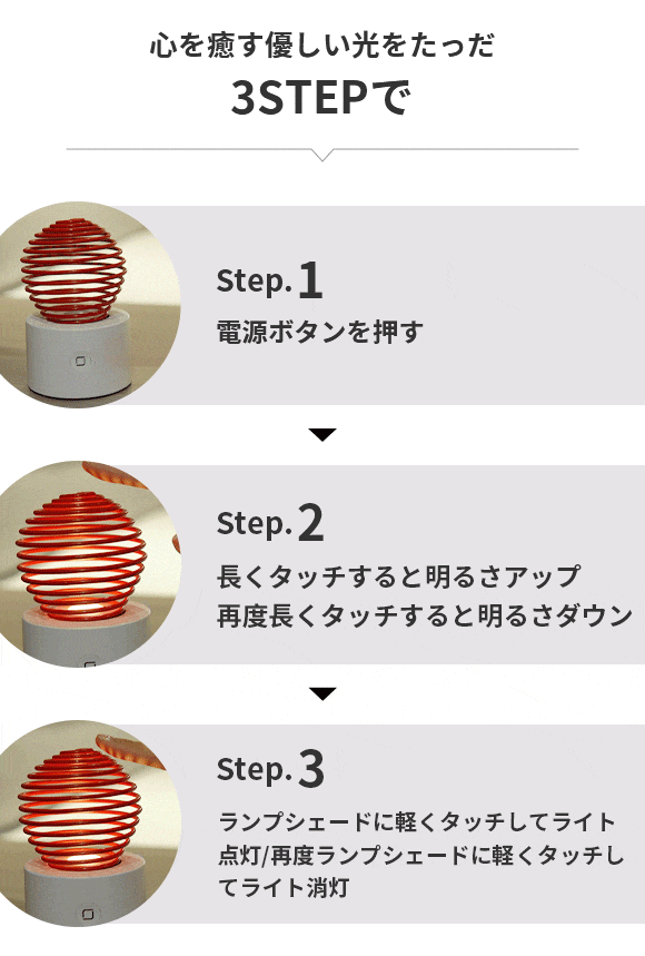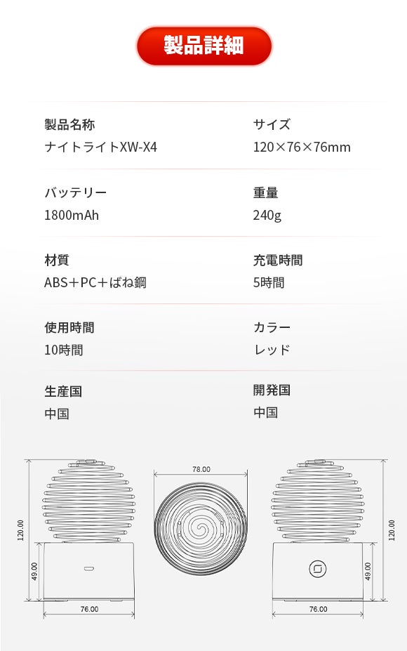 XW-X4はばね型デザインのランプシェードがユニークなナイトライトです。静電容量センサーを採用しており、ランプシェードに軽く触れるだけで明るさを無段階調整でき、ちらつかないLEDソフトライトの目に優しい光で空間を照らします。