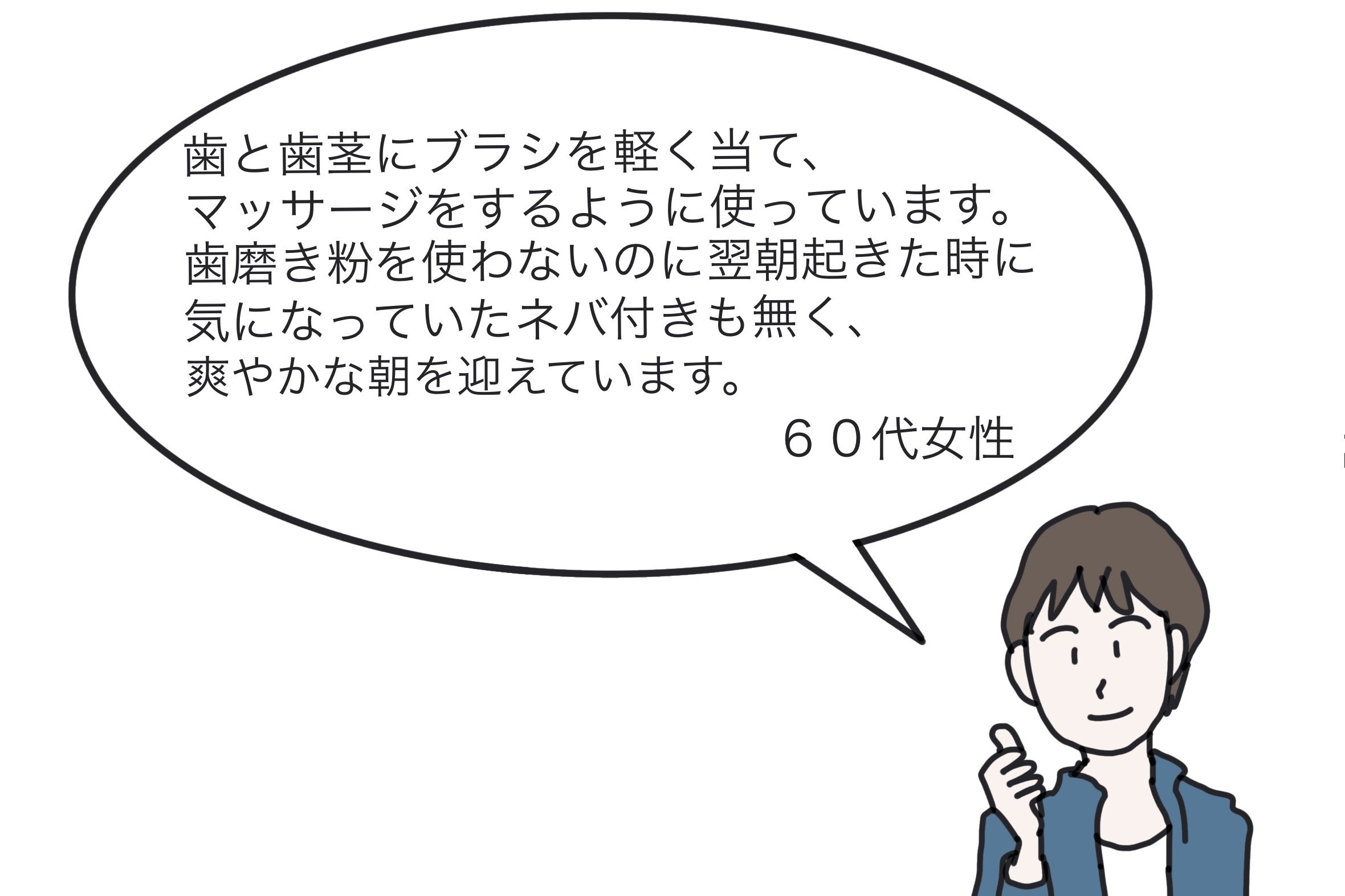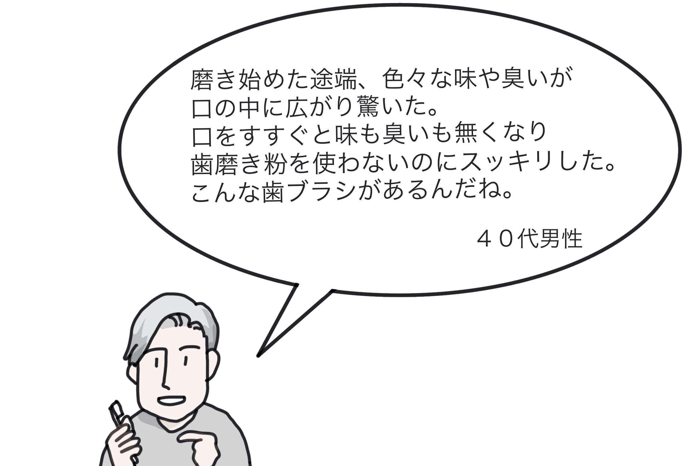 繰り返しますが《SMND》はプラスとマイナスの両極のイオンを持つ素材。《SNMD》のプラスイオンが、口腔内の菌(マイナスイオン)に反応し、抗菌作用が働きます。つまり、化学物質や歯磨き粉を使わずに口腔内を清潔にできる歯ブラシです。