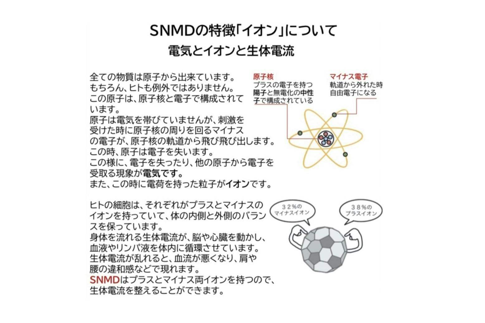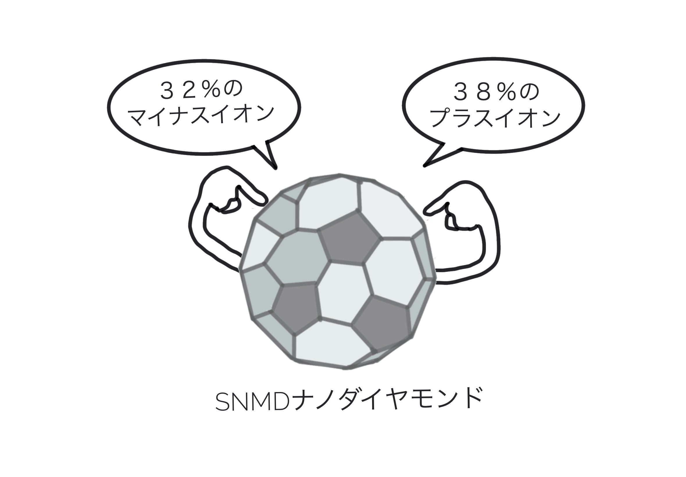 《SNMD》は、世界最小クラスの2.8㎚サイズのナノダイヤモンドであり、本体がプラスとマイナス両極のイオンを持つ新素材です。※通常1つの物質は1種類のイオンしか表面に持つことはありません。