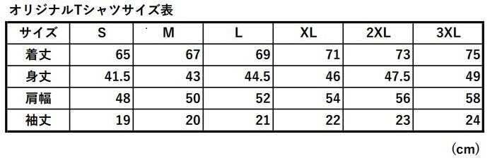 オリジナルTシャツのサイズに関しては以下のサイズ表をご確認ください。