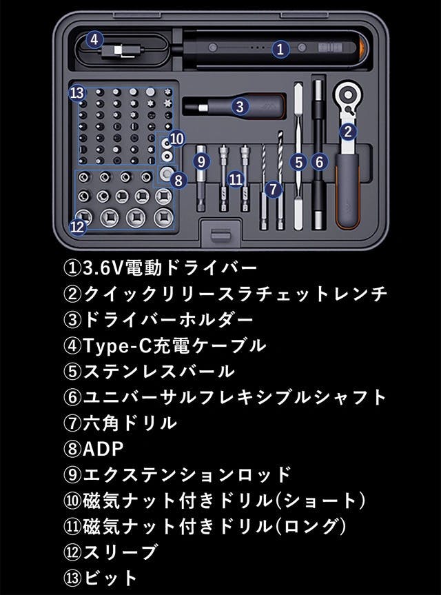5段階のトルク調節機能、高品質バッテリー、ロック機能、LEDライトが搭載された電動ドライバーに狭いところでも作業が可能になる延長コード、使いやすいバールや耐久性の高い多種多様なビットまでセットになった痒い所に手が届く多機能ツールです。