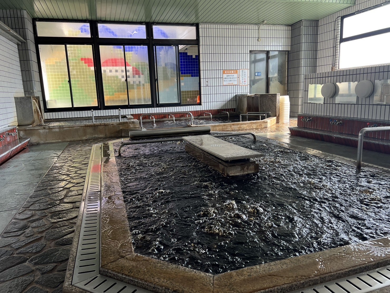 まずれもん湯の一番の特徴は黒湯、地下800mからのとろとろとしたモール泉が全湯船に湧き出ています。
