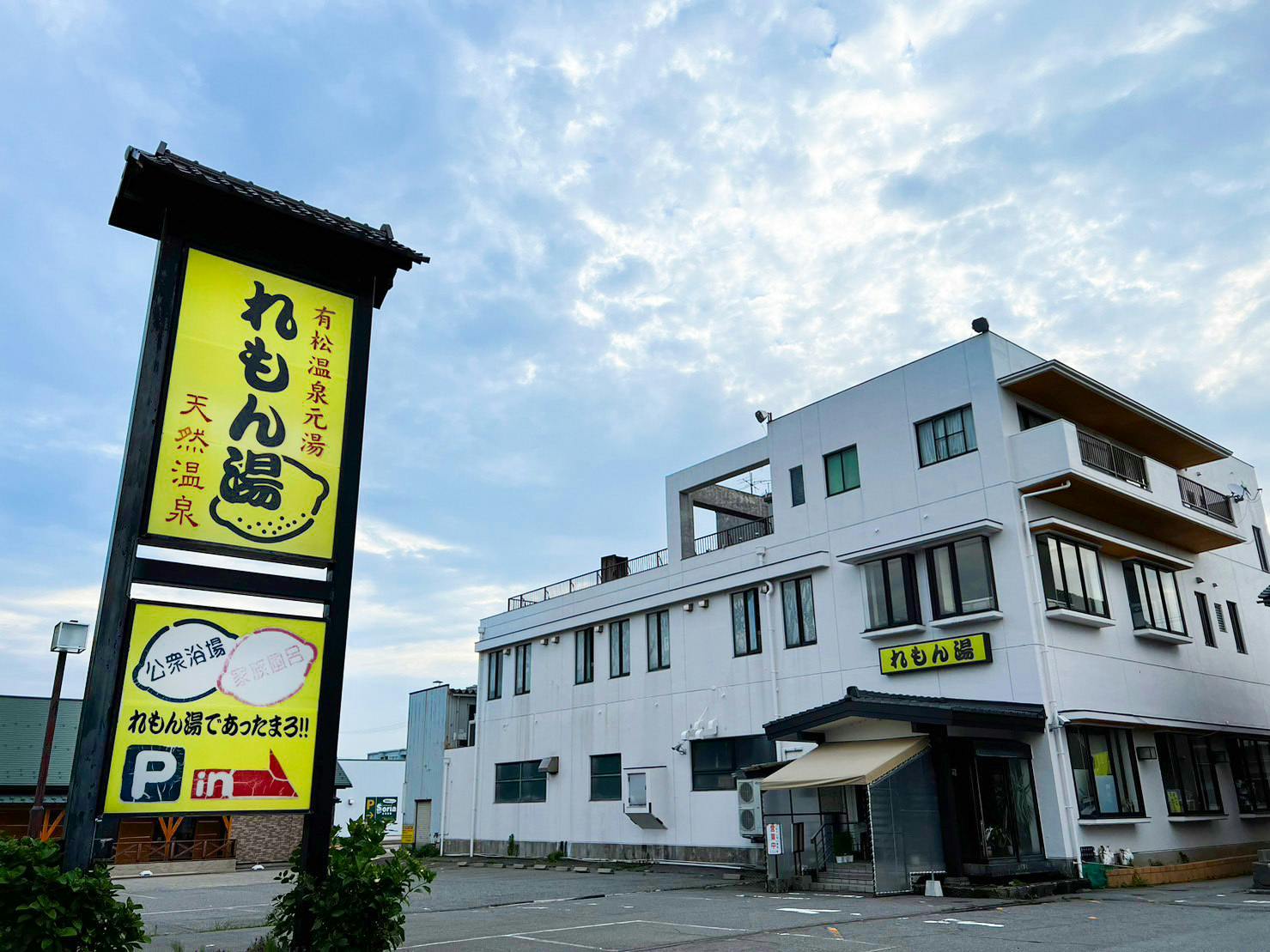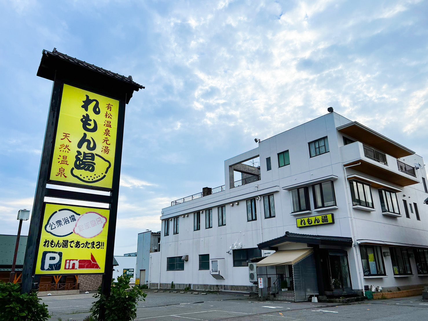 れもん湯は金沢市有松、金沢駅から四十万方面行のバスに乗り「寺地バス停前」下車で目の前の場所に位置します。