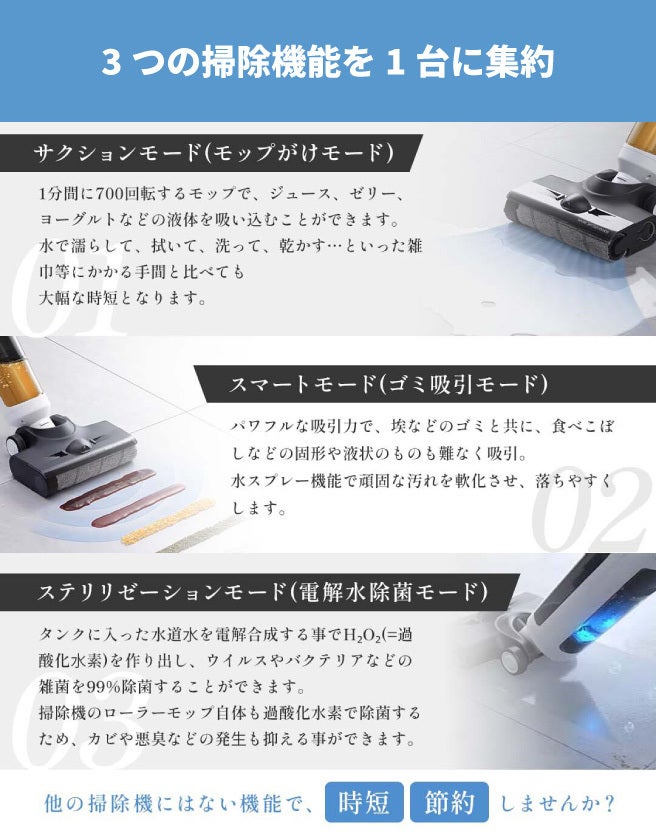 また同時に雑菌繁殖の元となりかねない掃除機のローラーモップも同時に除菌しますので、カビ等の発生も予防し、悪臭などの発生も抑える事ができるなど非常に優れた機能を持っています。