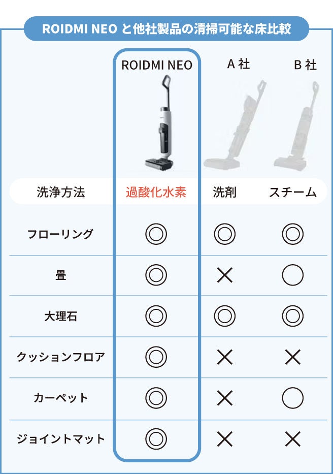 過酸化水素水による除菌&清掃をおこなうROIDMI NEOは、あらゆる床を掃除することが可能な数少ない掃除機です。