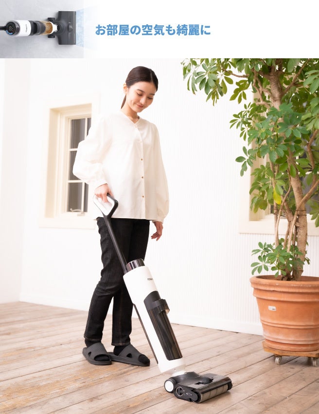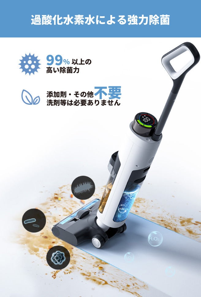 過酸化⽔素は床を清潔にするだけでなく掃除機内部のローラーモップやタンク内部も除菌してくれるため、カビや悪臭などの発⽣も抑える事ができます。