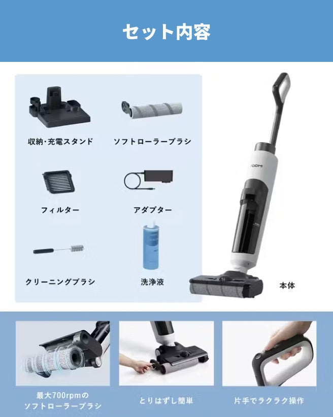 掃除機の吸引力でローラーブラシが高速回転し、従来のモップや掃除機では落とせなかった汚れも片手で簡単に落とすことができます。