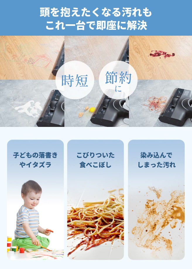 洗剤を使用する掃除機では使えない床も存在するばかりか、子どもやペットが居る家庭では安全とは言えません。