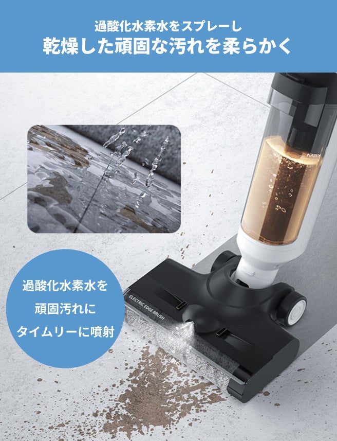 過酸化⽔素は床を清潔にするだけでなく掃除機内部のローラーモップやタンク内部も除菌してくれるため、カビや悪臭などの発⽣も抑える事ができます。