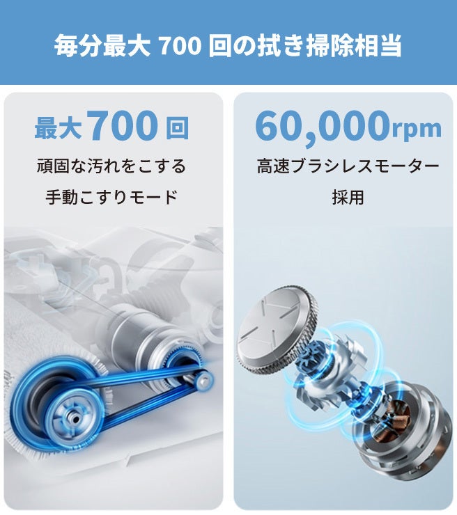 頑固な汚れを毎分最大700回こすることができ、あなたが手でこする以上の強力なチカラで頑固な汚れを撃退します。