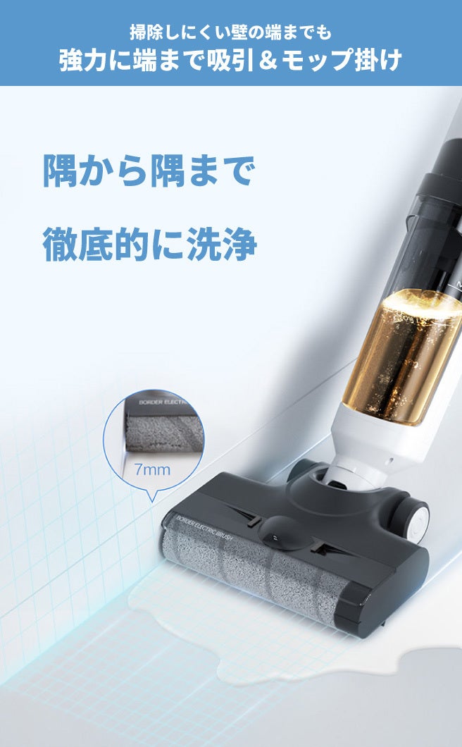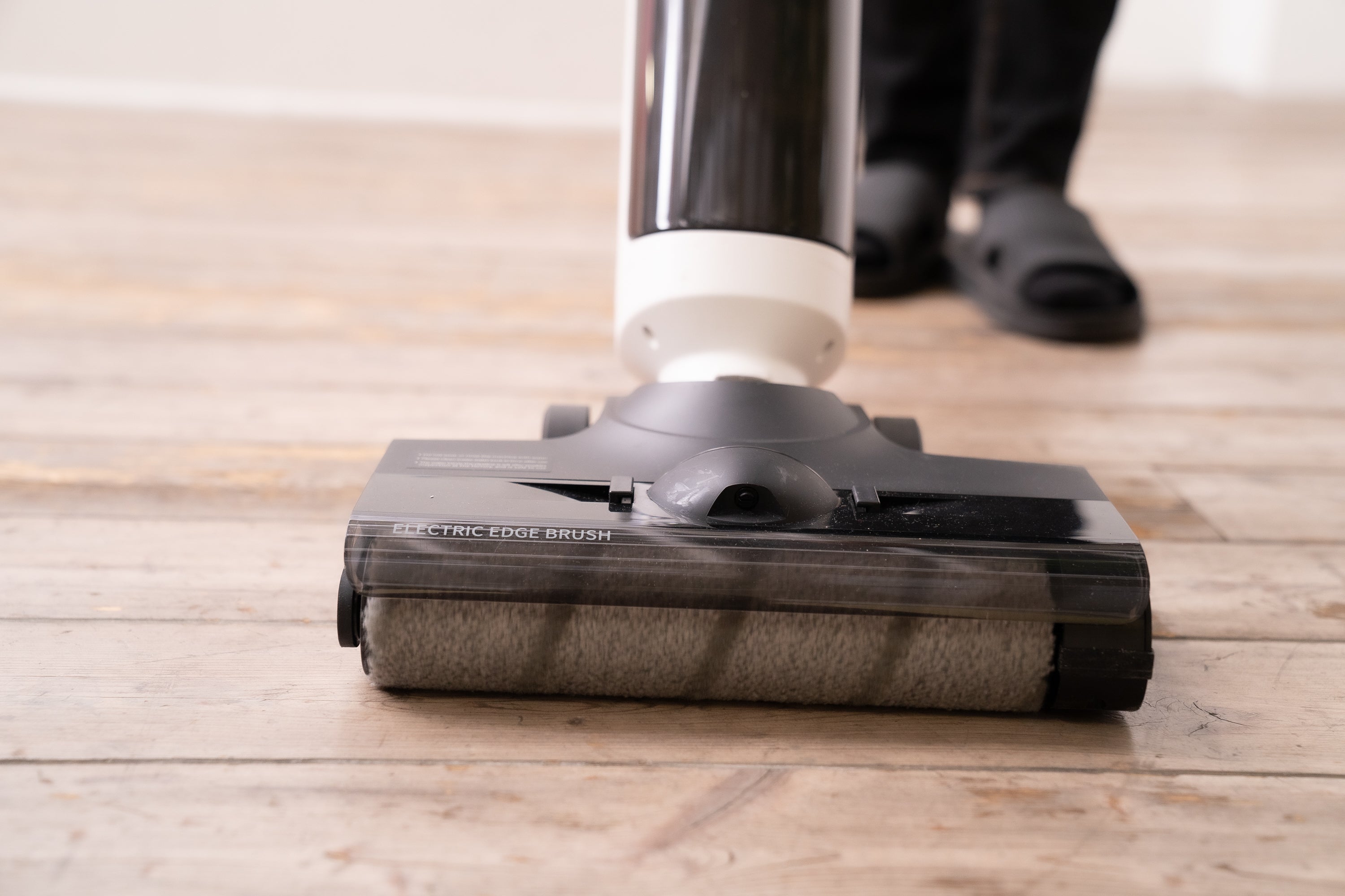 掃除機の吸引力でローラーブラシが高速回転し、従来のモップや掃除機では落とせなかった汚れも片手で簡単に落とすことができます。