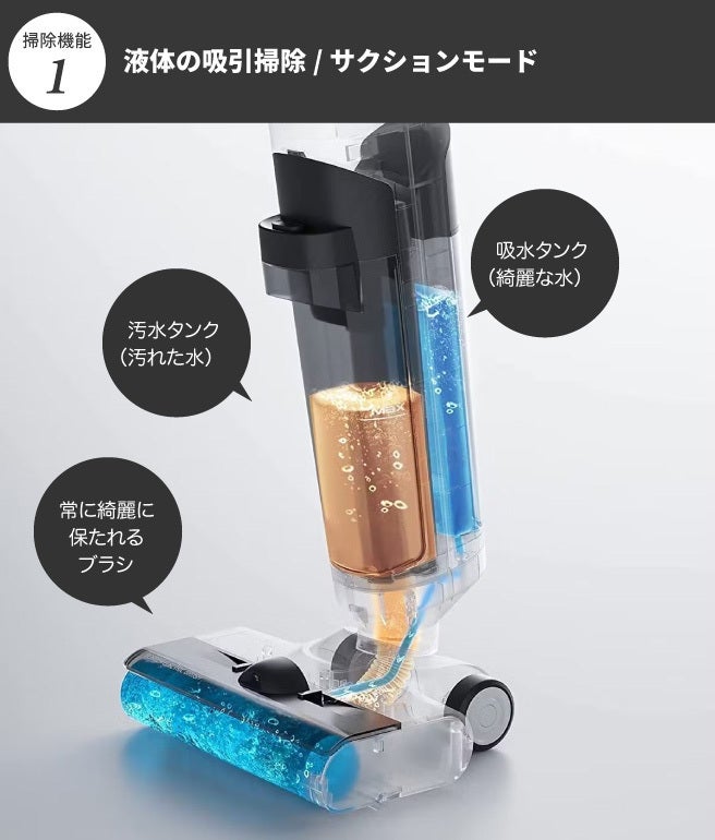 ROIDMI NEOには吸い込んだゴミと一緒に汚水を蓄積するタンクとは別に、綺麗な水を噴射するタンクも備えており、水をブラシヘッドの先端から噴射しながら床を塗らして床を掃除する機能を持っています。