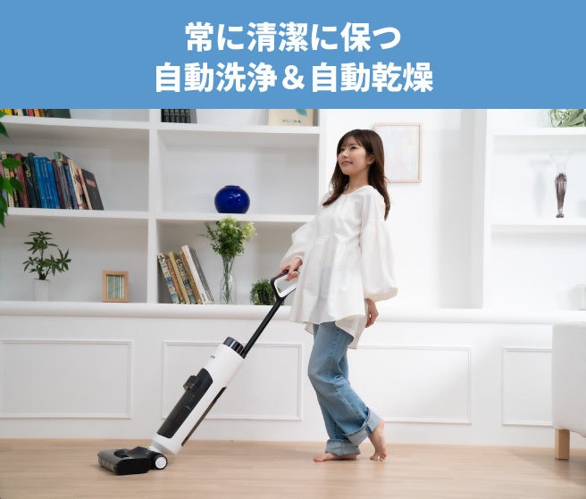充電時はボタンをワンプッシュするだけでソフトローラーブラシ、廃水タンク、パイプを⾃動的に洗浄します。