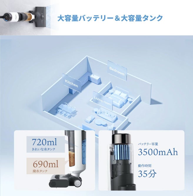 「ROIDMI NEO」は1回の充電で約150㎡(45坪分)の使用が可能です。