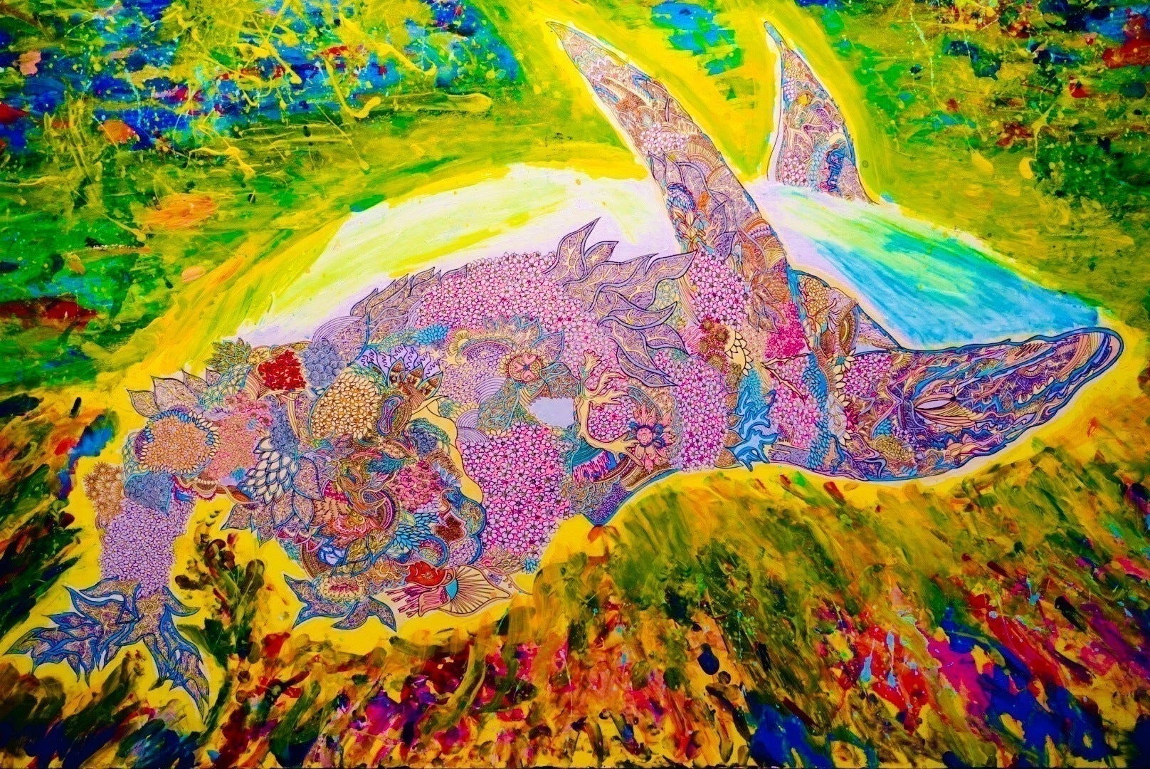 エンターテイメントは、人を楽しませたりもてなしたりすることで何かの経験や感情を提供する。アートにだってそれはあると感じます。私の制作の際に例えば、紙一枚の限られた空間であっても、沢山の色を入れたり、大胆さと繊細さを兼ね備えたり、時にはその人の名前や思い出などを盛り込み、一度だけでなく何度も楽しんでもらえるような描き方を心掛けています。自身の作品を体感し何かのきっかけや気づきになってもらえたらと思います。