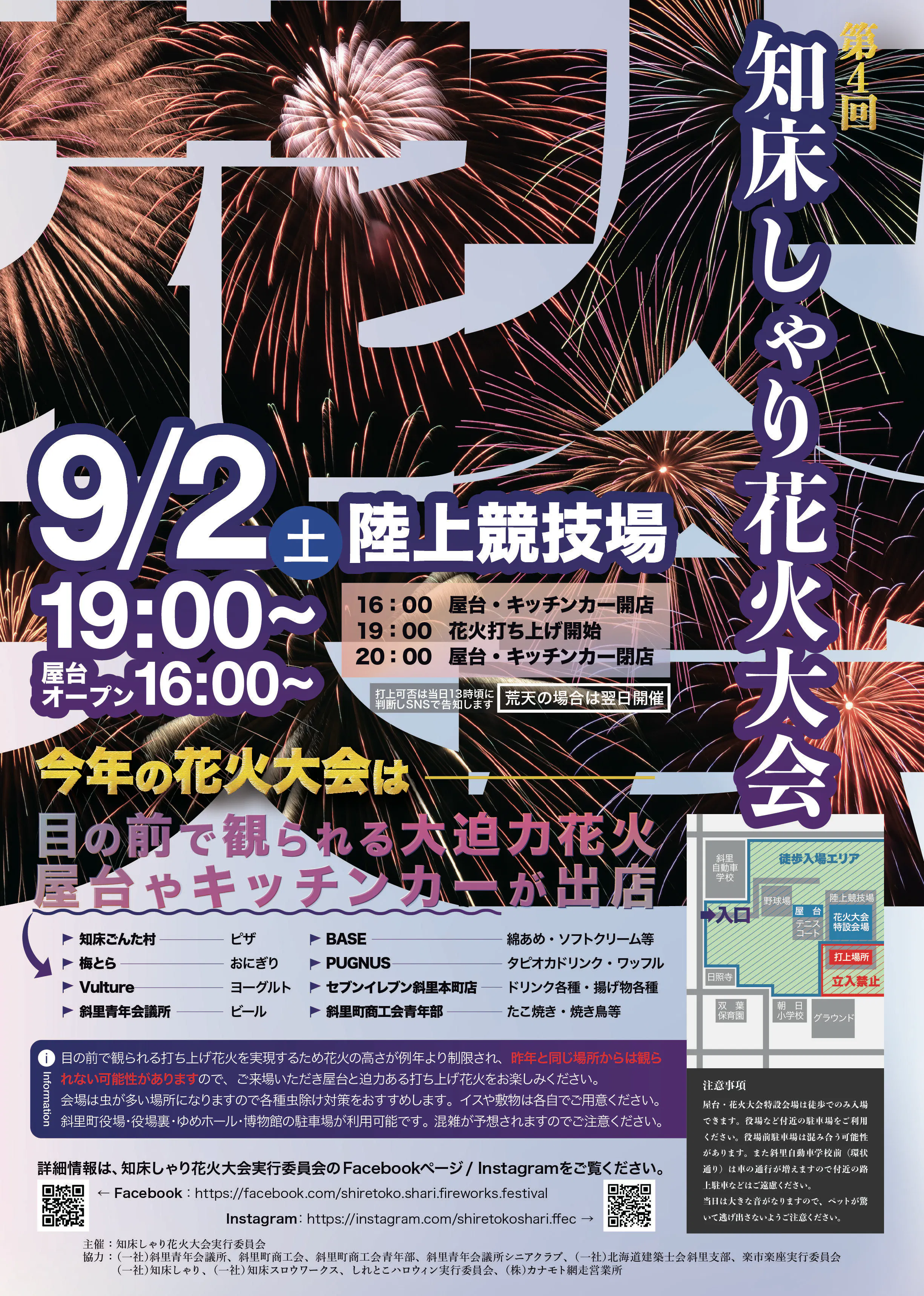 • 「第4回知床しゃり花火大会 目の前で打ち上げられる大迫力の花火大会を実現しよう!」プロジェクトオーナーの知床しゃり花火大会実行委員会です。目標金額を達成し、プロジェクトが8月末に終了したことをご報告いたします。皆様のご支援とご協力により、プロジェクトが成功し無事に終了することができました。心より感謝申し上げます。支援総額:282,000円支援者数:21※詳細はこちらからご覧いただけます。https://camp-fire.jp/projects/view/684824いよいよ明日9月2日(土)には、第4回知床しゃり花火大会が開催されます。斜里町陸上競技場にて19時打ち上げ開始予定となっております。16時より屋台がオープンしますので、ぜひ現地にて大迫力の打ち上げ花火をお楽しみください。当日の打ち上げ可否については、明日9月2日(土)13時頃に知床しゃり花火大会実行委員会のInstagramかFacebookページをご確認ください。https://www.instagram.com/shiretokoshari.ffechttps://www.facebook.com/shiretoko.shari.fireworks.festival会場は徒歩でのみ入場可能です。入口より徒歩にてご入場ください。役場・役場裏・ゆめホール・博物館の駐車場が利用できますが、混雑が予想されますのでご注意ください。 もっと見る
