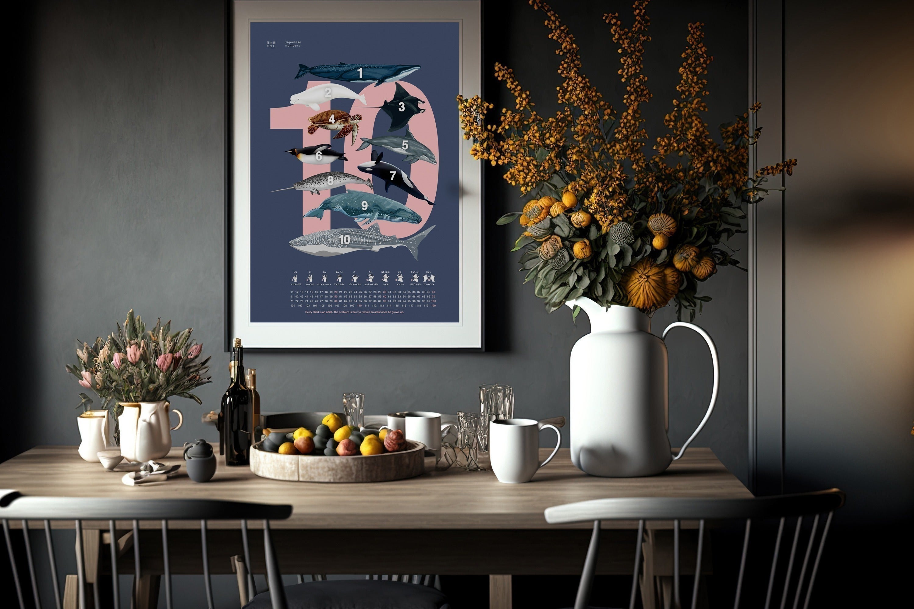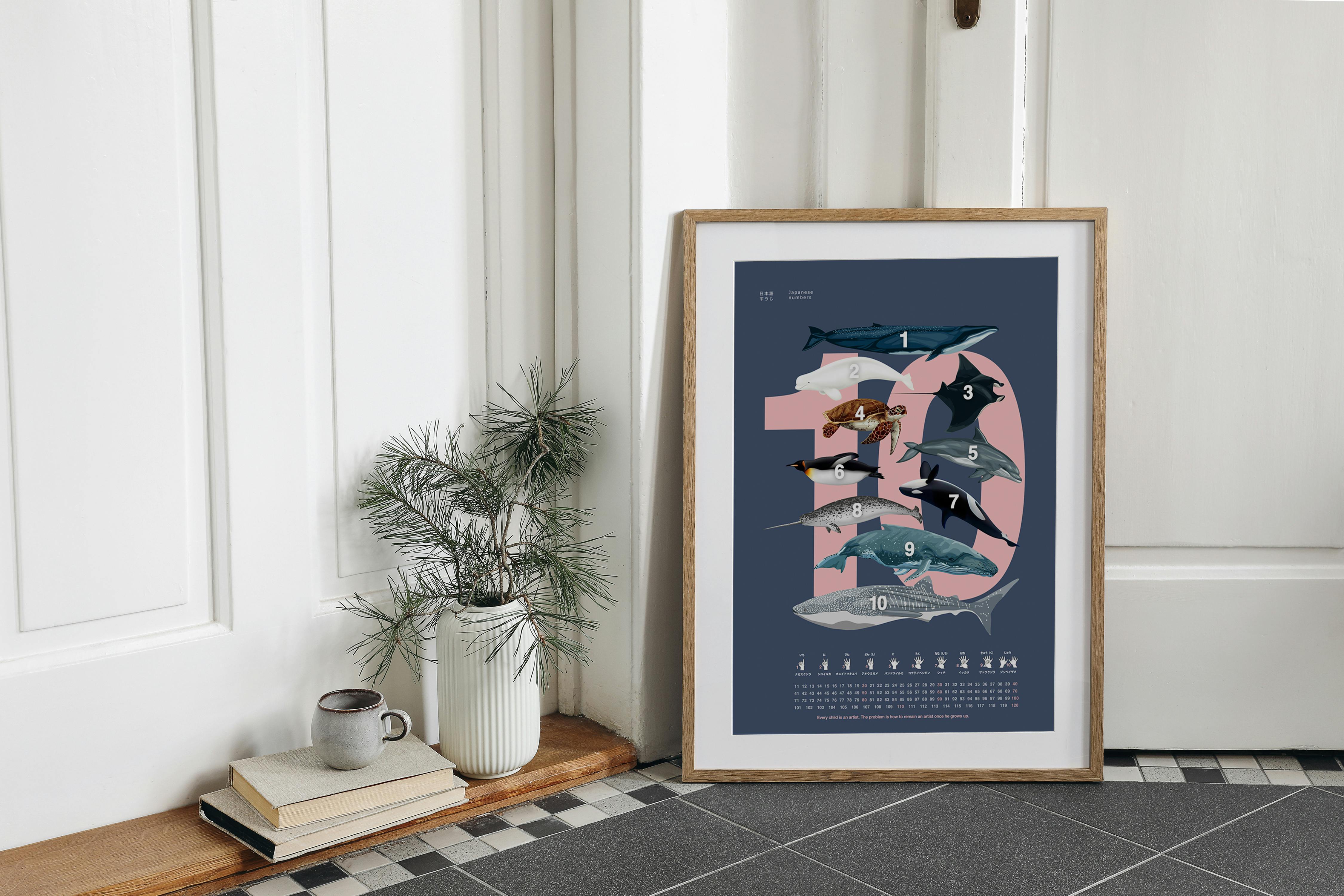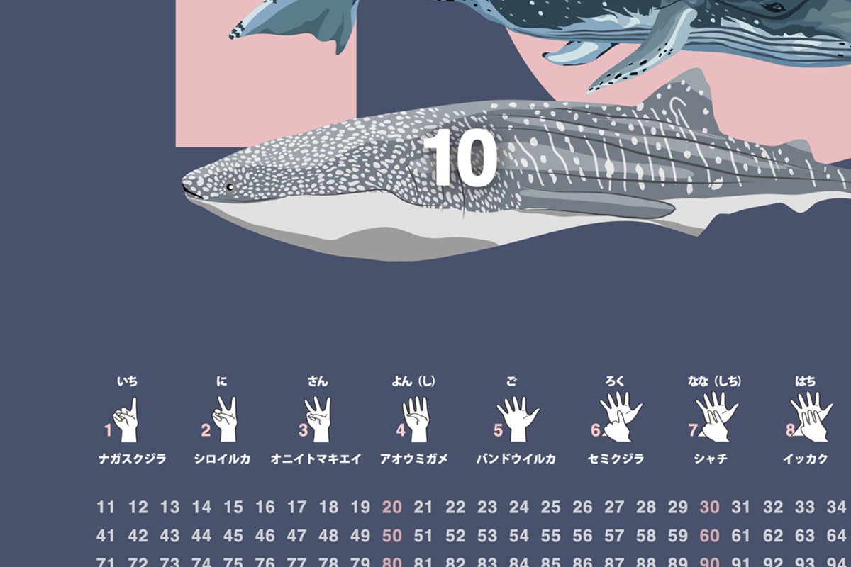 泳ぐ動物に限定して描いた「動物数字ポスター」はお風呂にぴったり。