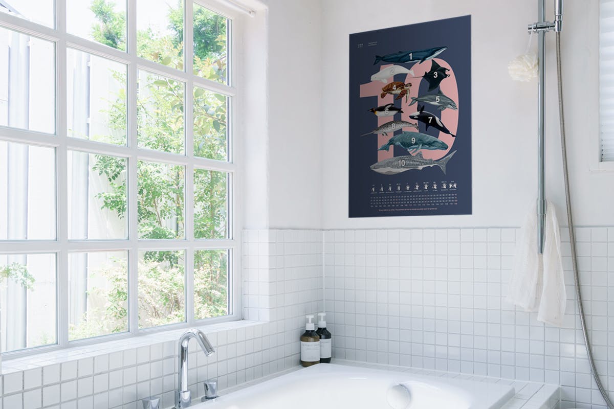 大きめなポスター定番サイズ50x70cmなら、バスルームでは壁紙を変えるくらいのインパクト。