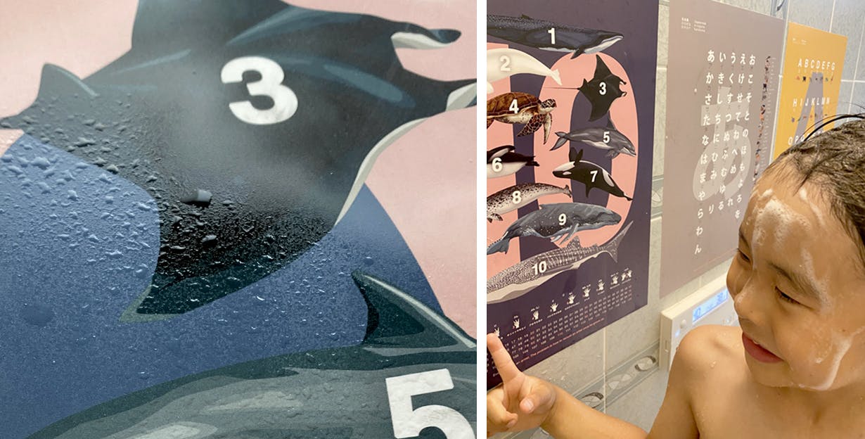 ▶︎ 耐水性。繊細できれいなデジタル印刷。非常に滑らかで、汚れてもサッ!と拭き取れます。子どもが指差すのはA3サイズ。