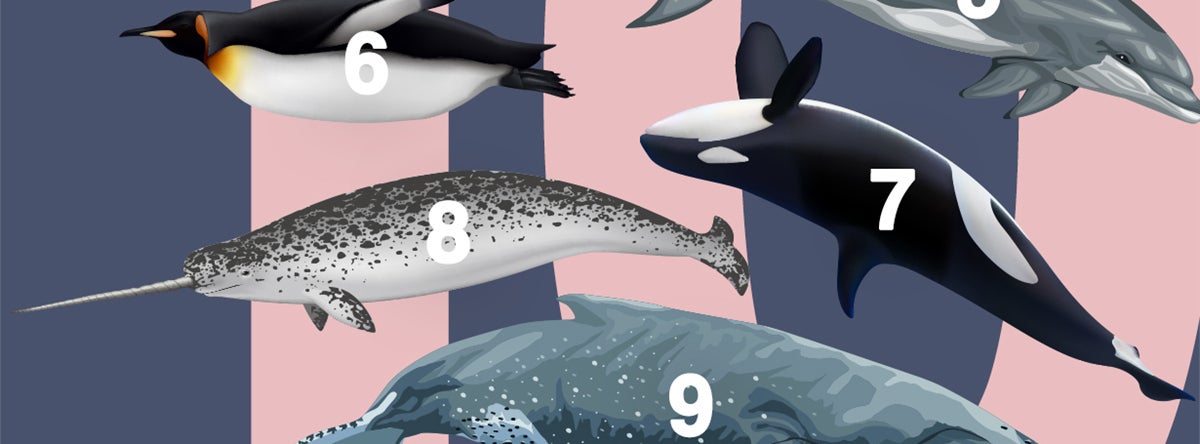 全員が泳ぐどうぶつ達ではありますが、哺乳類(シャチ、イッカク、クジラ類、イルカ類、)、魚類(オニイトマキエイ、ジンベイザメ)、鳥類(コウテイペンギン)、爬虫類(アオウミガメ)が混在しています。
