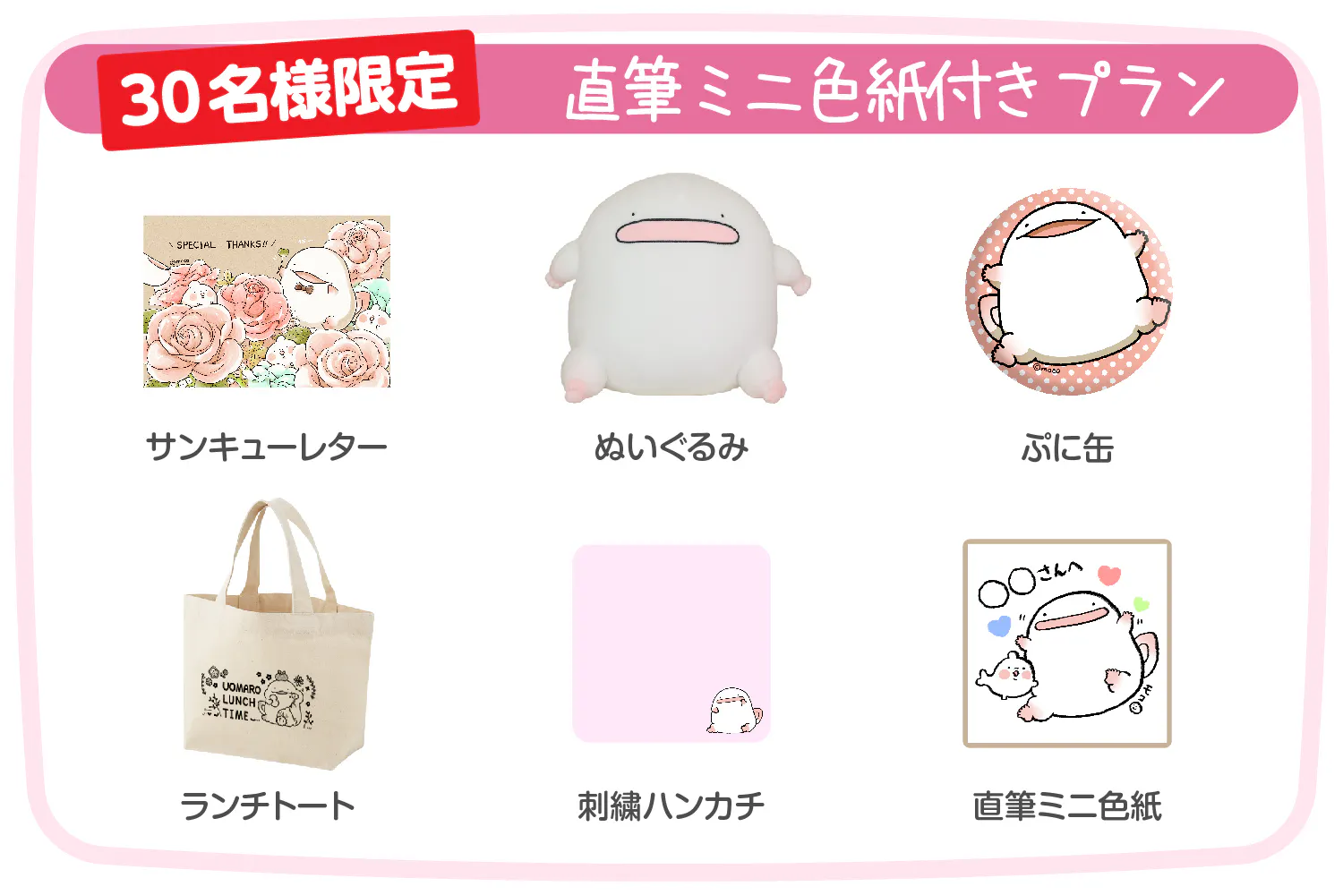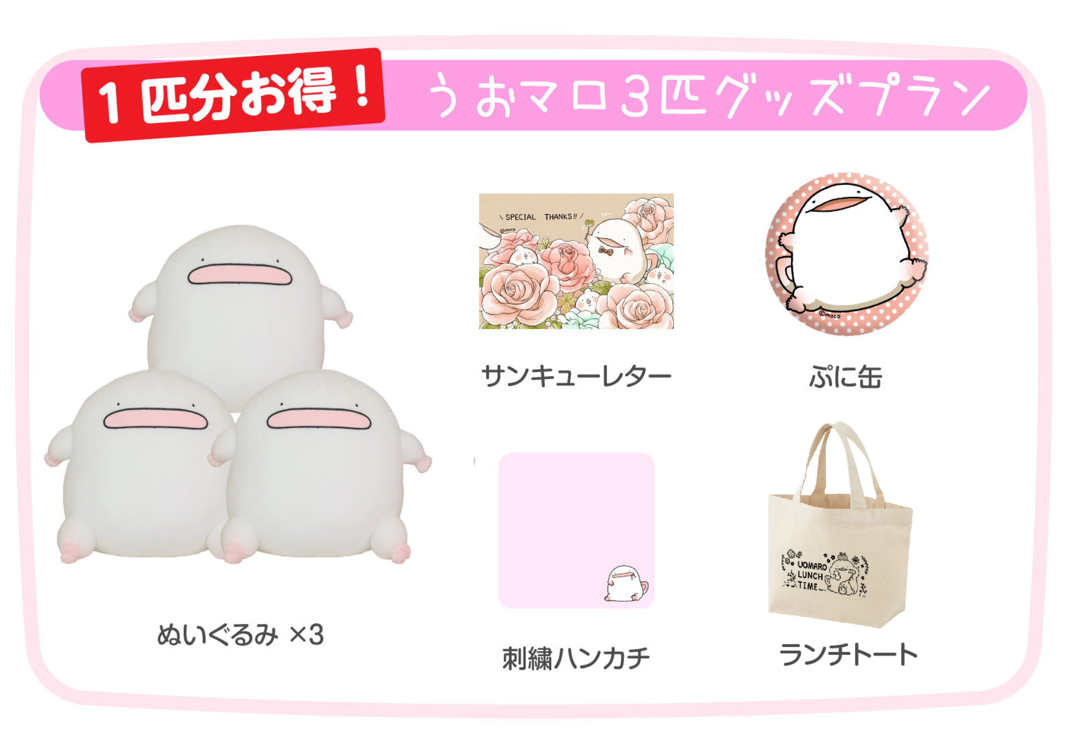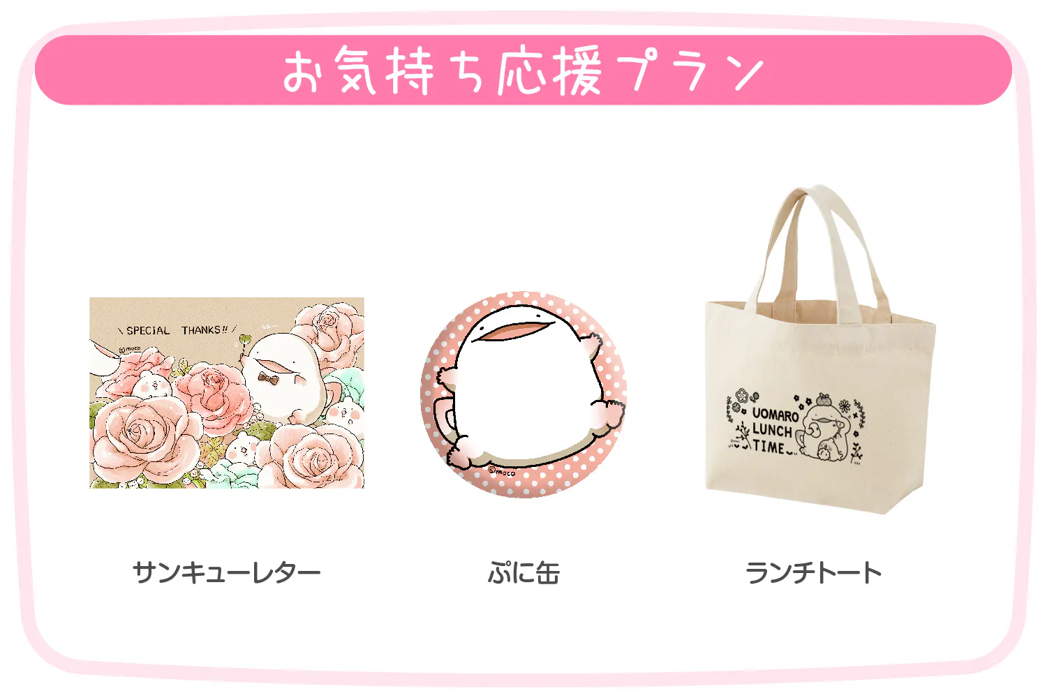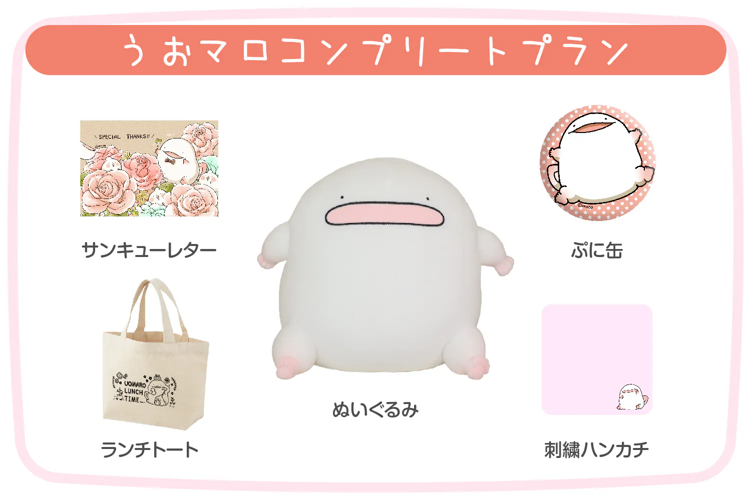 リターンはまだ制作したことのないグッズを中心に、日常使いしやすいものを選んでみました。ぬいぐるみでもグッズでも毎日うおマロをお側においていただけたら嬉しいです!