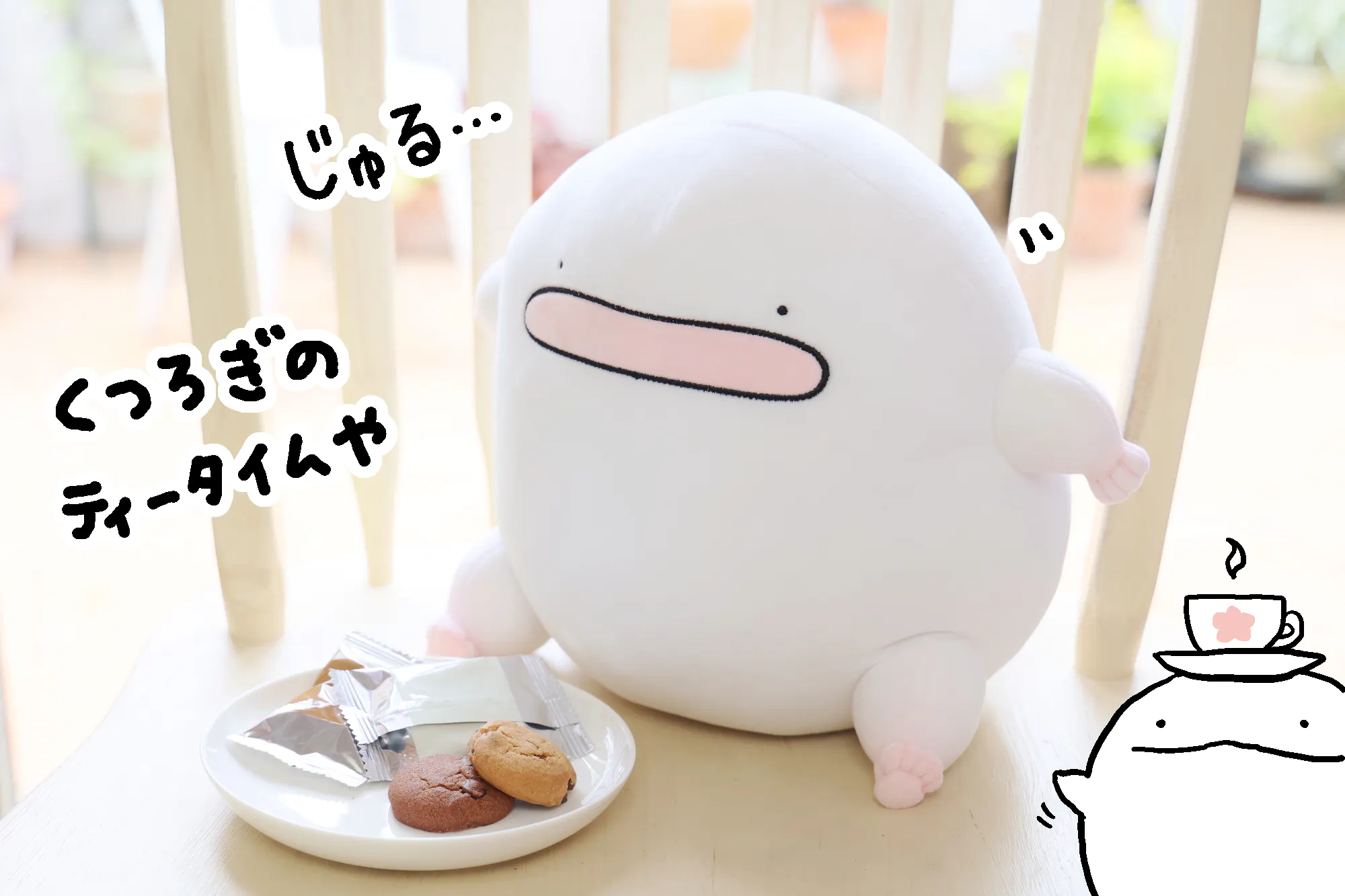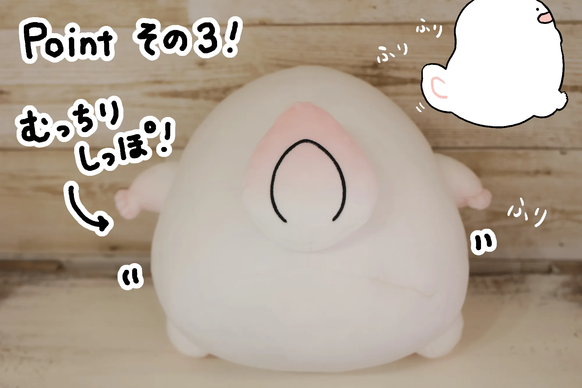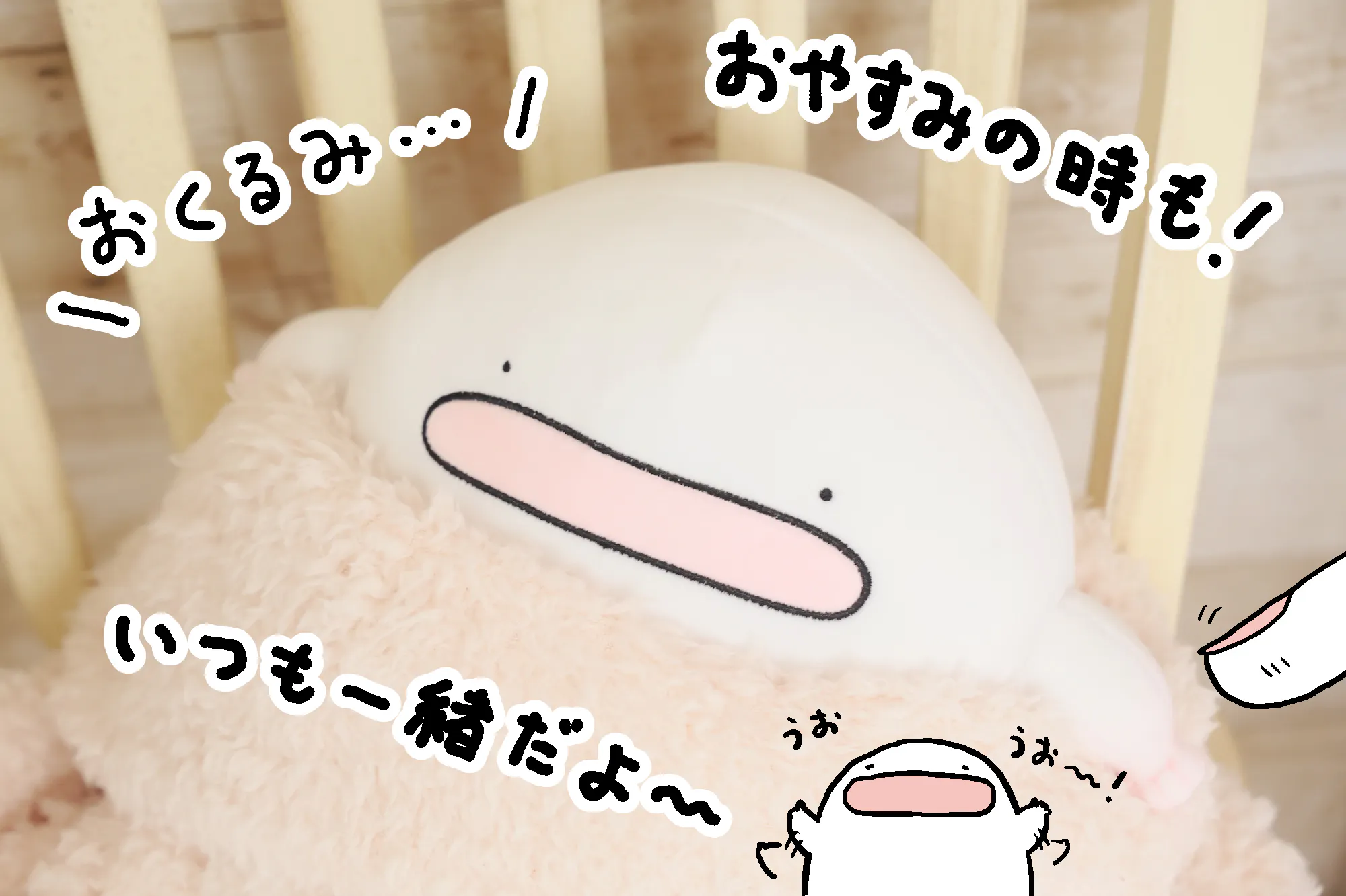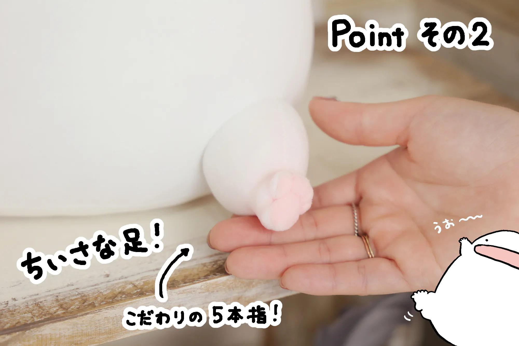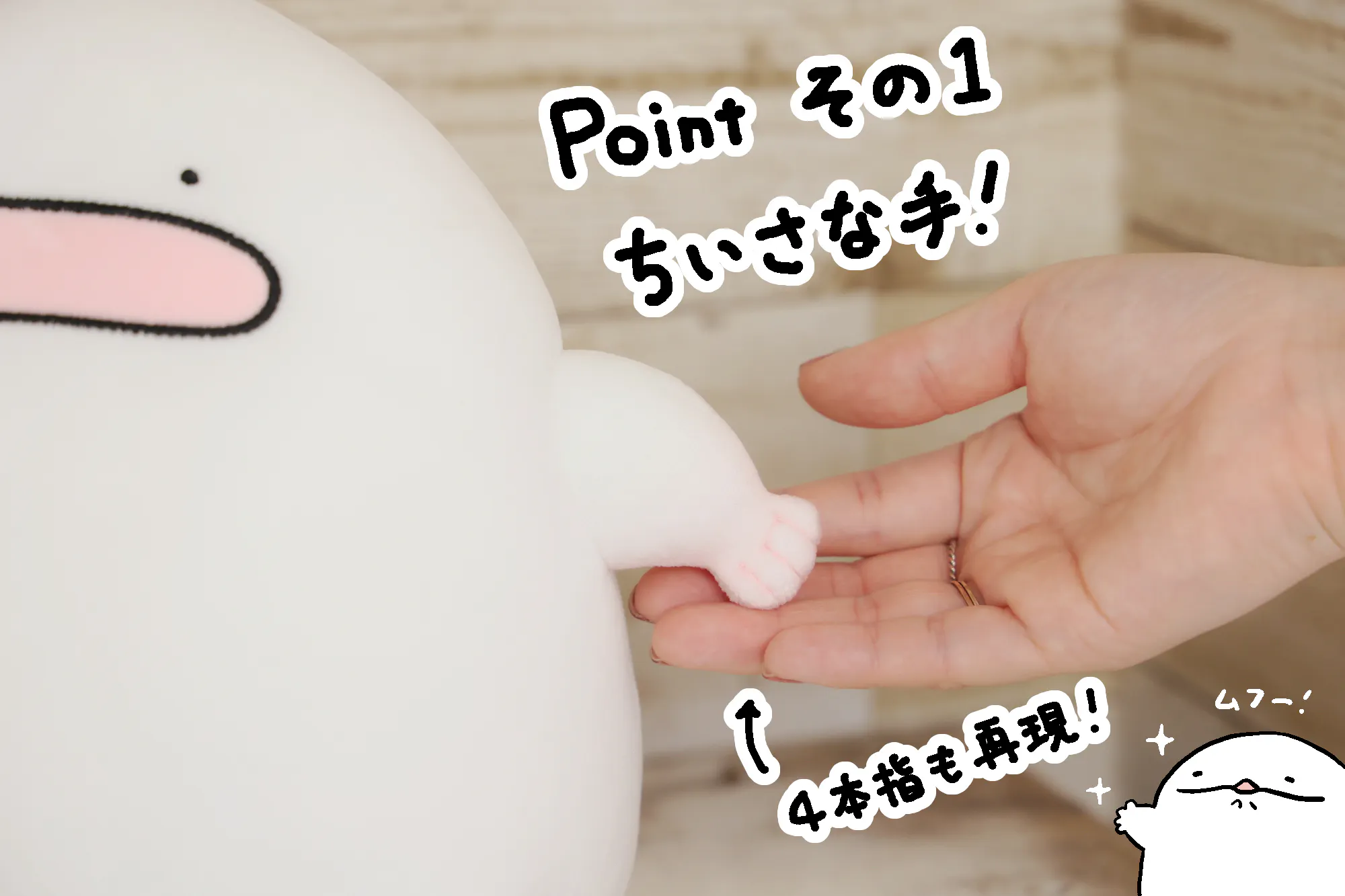 まさにSNSで更新している「うおマロ」の姿そのまま!特に体に対して小さな手足、そして指先の表現にはとても感動しました。お迎えいただけた際はぜひ「ぎゅ〜っ」と握ってみてほしいです!大きさも膝にちょこんと乗る程よいサイズで、もちもちと柔らかな素材感にとっても癒されます。
